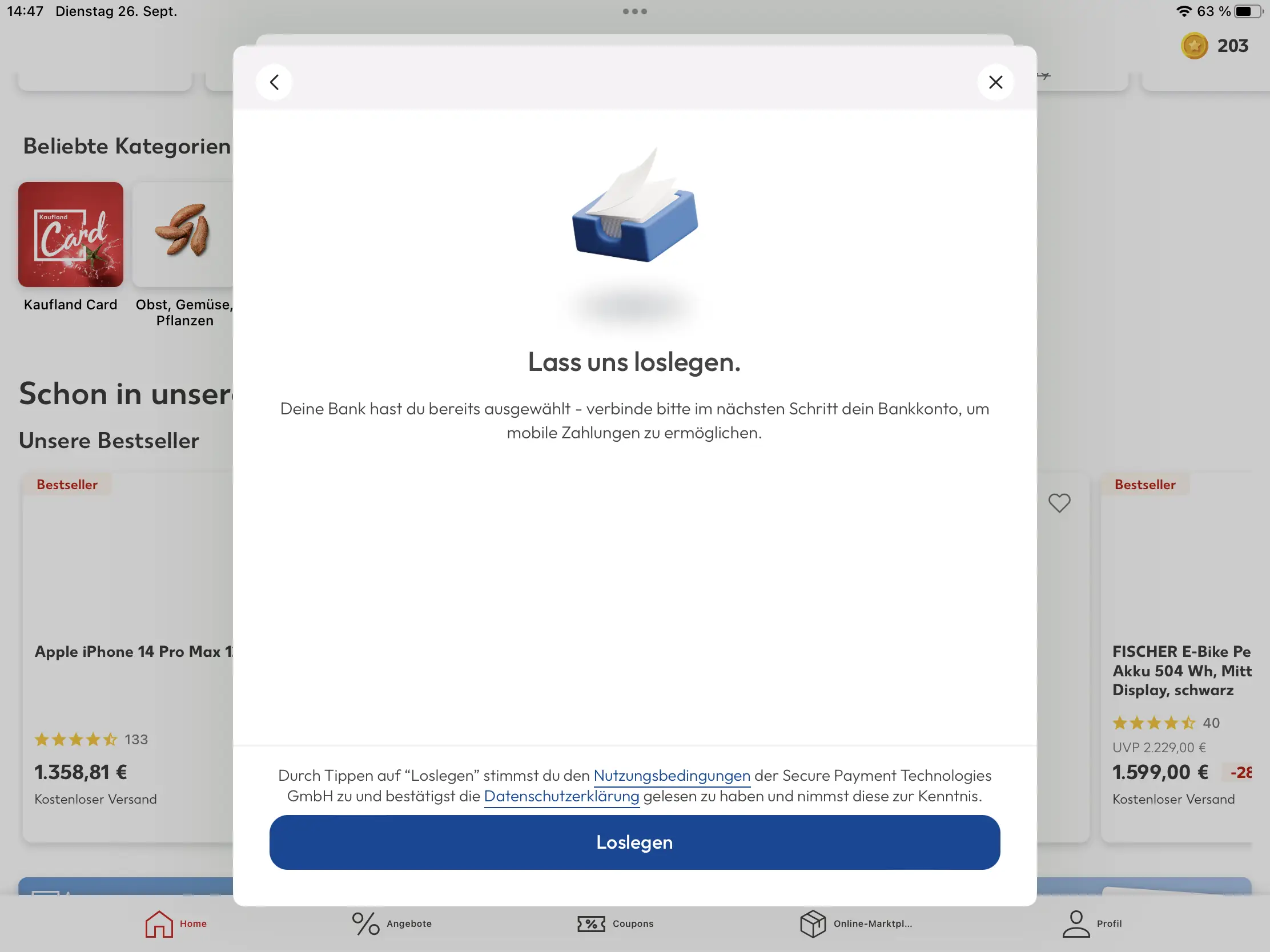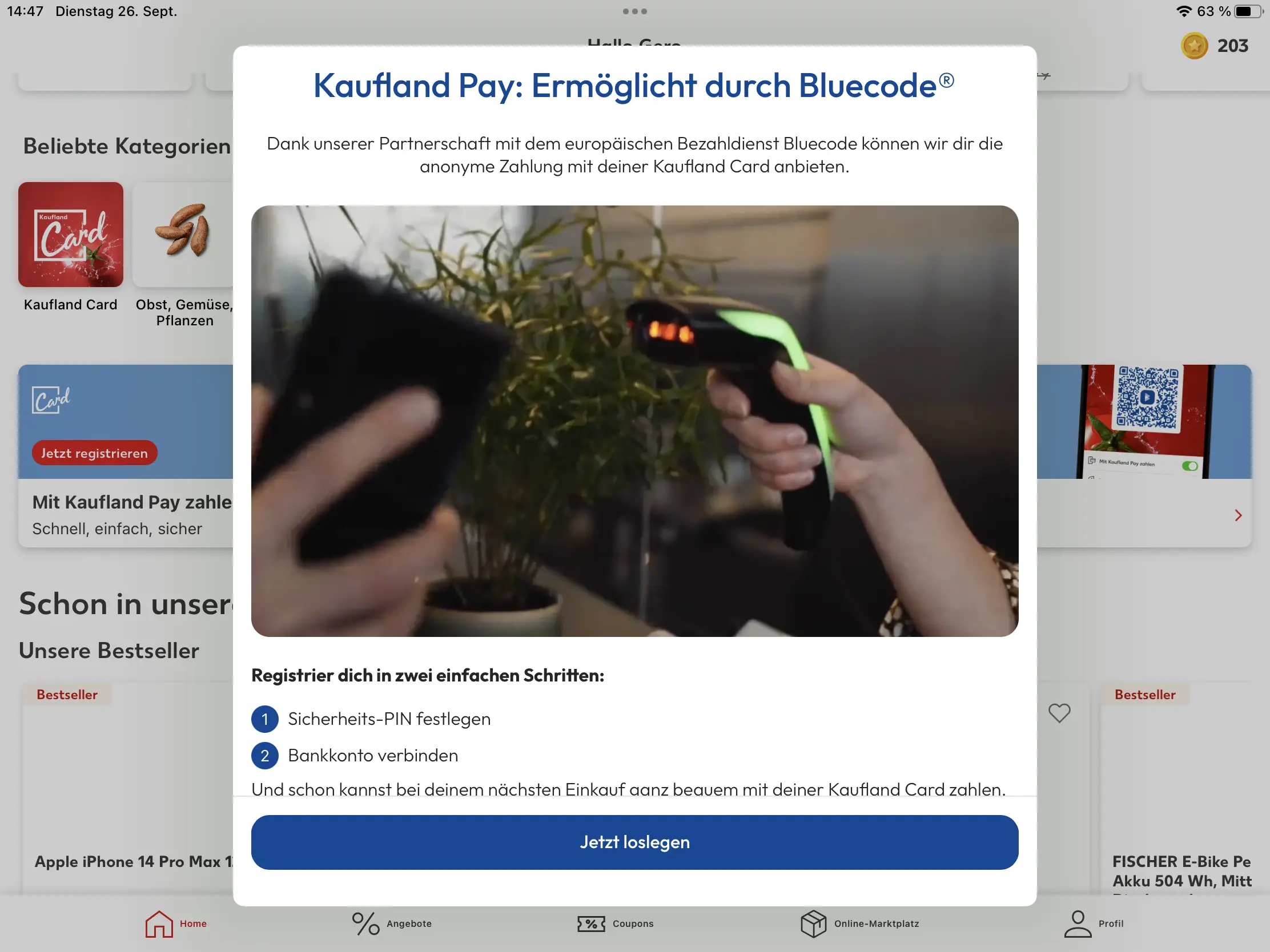 Damit dies auch funktioniert, muss einmalig ein Bankeinzug eingerichtet werden. Dazu in der Kaufland-App auf der Startseite den Eintrag "Mit Kaufland Pay zahlen - Jetzt registrieren." antippen. Danach werden Sie durch die Anmeldung von Kaufland-Pay geführt. Kaufland Pay wird über die Firma Bluecode® abgewickelt. Damit es funktioniert, muss zuerst eine Sicherheits-PIN eingerichtet werden. Diese muss vier- oder sechsstellig sein. Nach der Vergabe kann auch die Touch-ID verwendet werden (Fingerabdruck, wenn eingerichtet). Dann muss eine Bank angegeben werden, wie zum Beispiel die Postbank, Deutsche Bank oder die Sparkassen. Bei dieser Bank muss man sich dann einmalig über das Bank-Login anmelden. Nun noch ein paar persönliche Daten und nach einer Bestätigung der E-Mail-Adresse ist die neue Zahlungsfunktion bereits einsatzbereit.