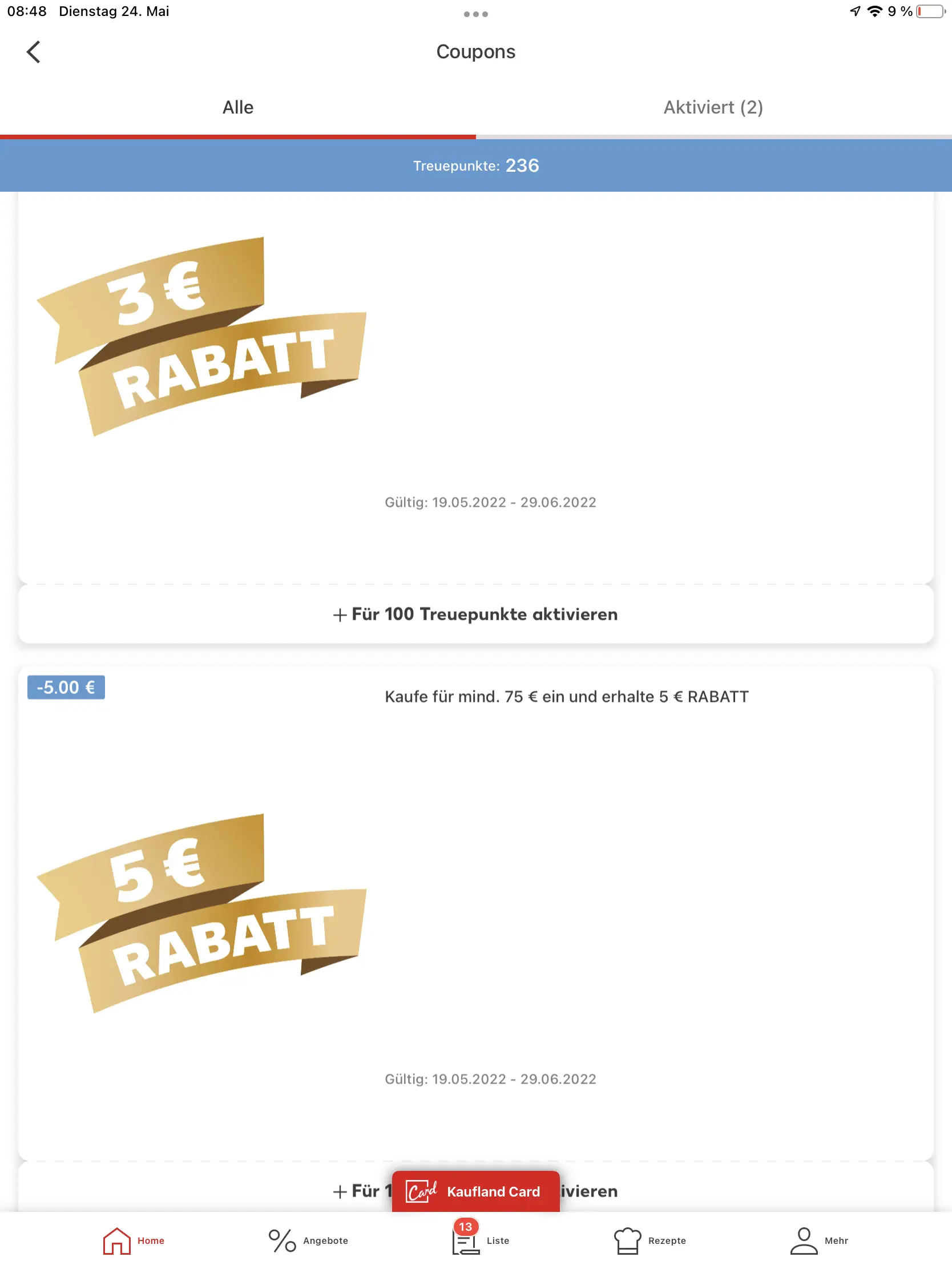 Wenn möglich, den betreffenden Rabattcoupon schon vorher aktivieren. Ich hatte schon das Problem, dass ich ihn an der Kasse aktivieren wollte und dies einfach nicht ging. Warum, das weiß ich auch nicht. Vielleicht, weil ich im Kaufland-Netzwerk eingeloggt war. Ich hatte mit der Aktivierung so lange gewartet, bis ich an der Scannerkasse wusste, für wie viel ich gekauft habe. Mittlerweile zähle ich den Betrag bereits beim Einkaufen mit der App "Einkaufrechner" vorher zusammen.