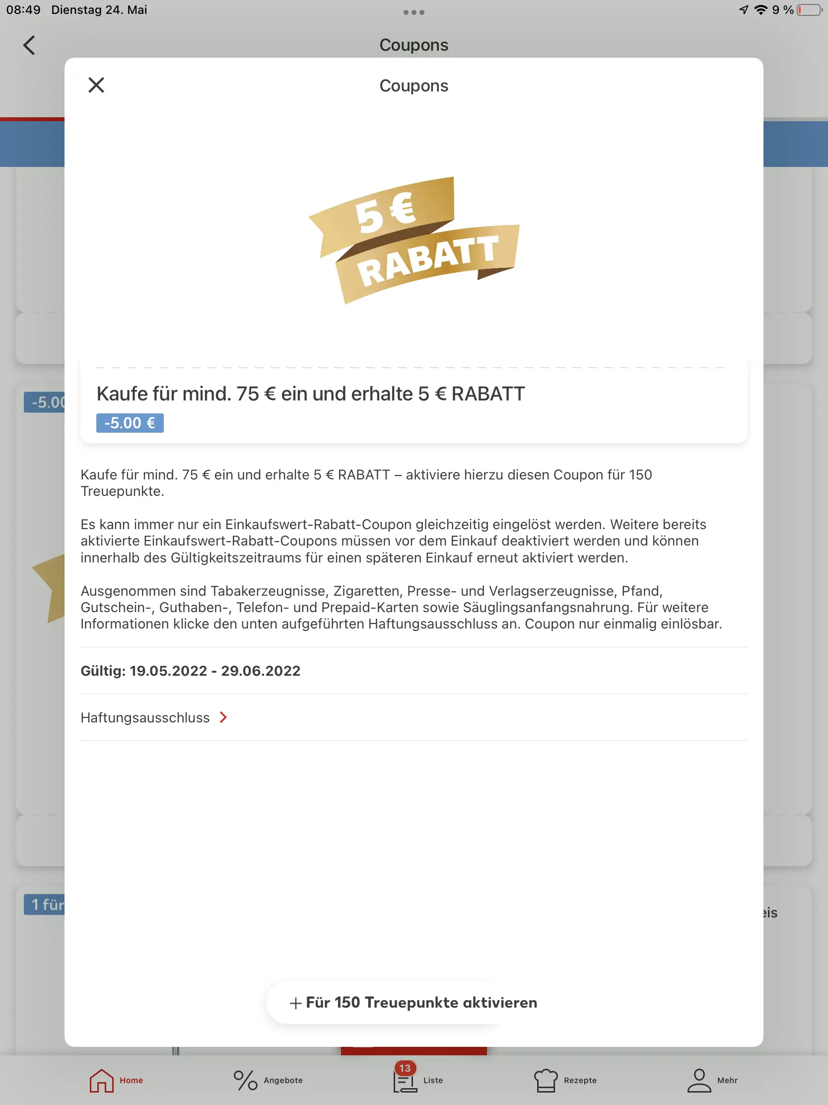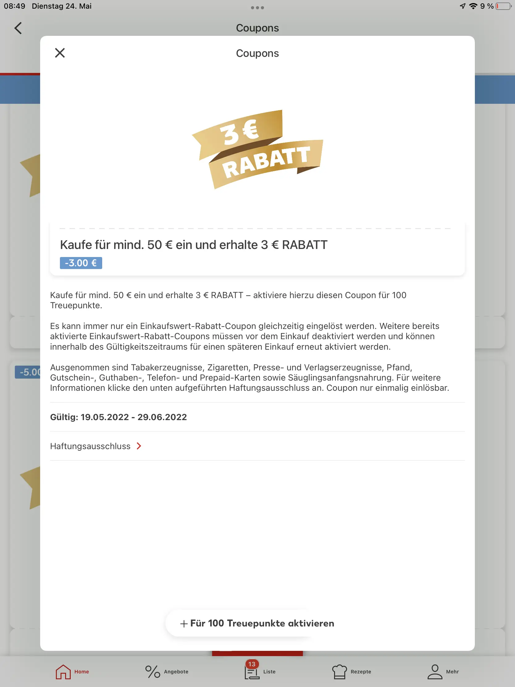 Wenn der Inhalt im Einkaufswagen also beispielsweise 43 € beträgt, dann kann der 2-Euro-Rabatt-Gutschein eingelöst werden. Aber wenn sich in Ihren Einkaufswagen auch Pfandflaschen oder Zigaretten oder Zeitungen/Bücher befinden, so muss man diesen Betrag abziehen. Sinkt der Betrag dann unter 40 €, bekommt man auch die 2 € des Rabatt-Coupons nicht. Ist der Coupon nicht verwendet worden, dann unbedingt wieder deaktivieren, um die Kundenpunkte wieder zurückzubuchen.