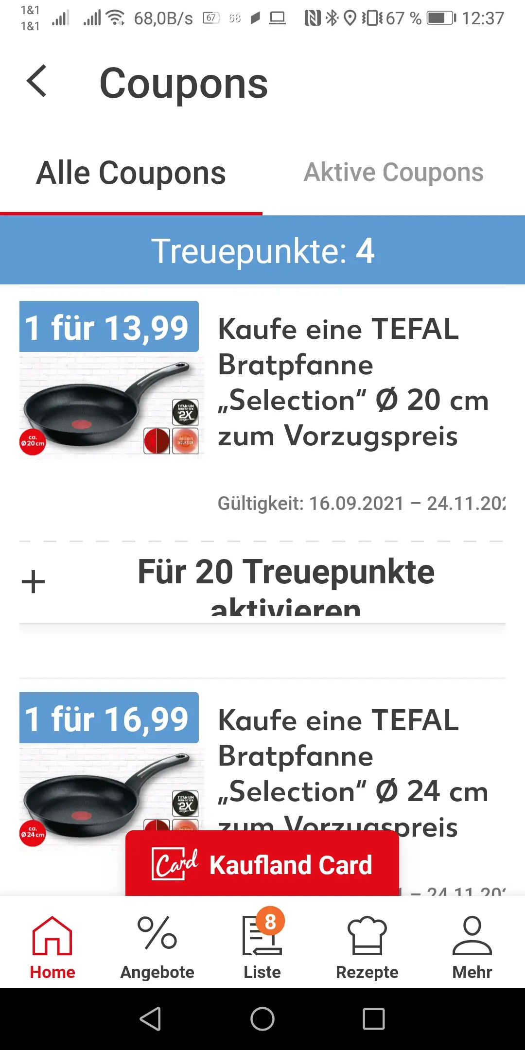 Einlösen der Treuepunkte: Scrollt man die Rabattcoupons nach unten, dann stehen dort die Artikel, welche Du mit Treuepunkten preiswerter erwerben kannst. Meist sind es Markenartikel. Zum Beispiel Pfannen und Töpfe von Tefal. Es könnten aber auch Werkzeuge von Bosch sein usw.