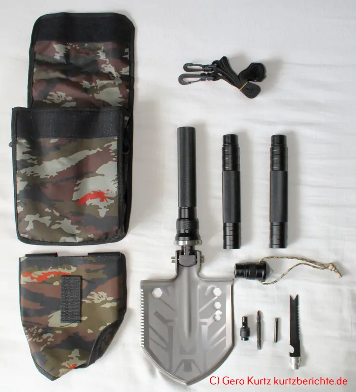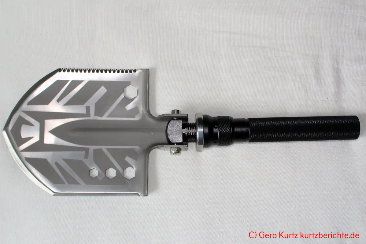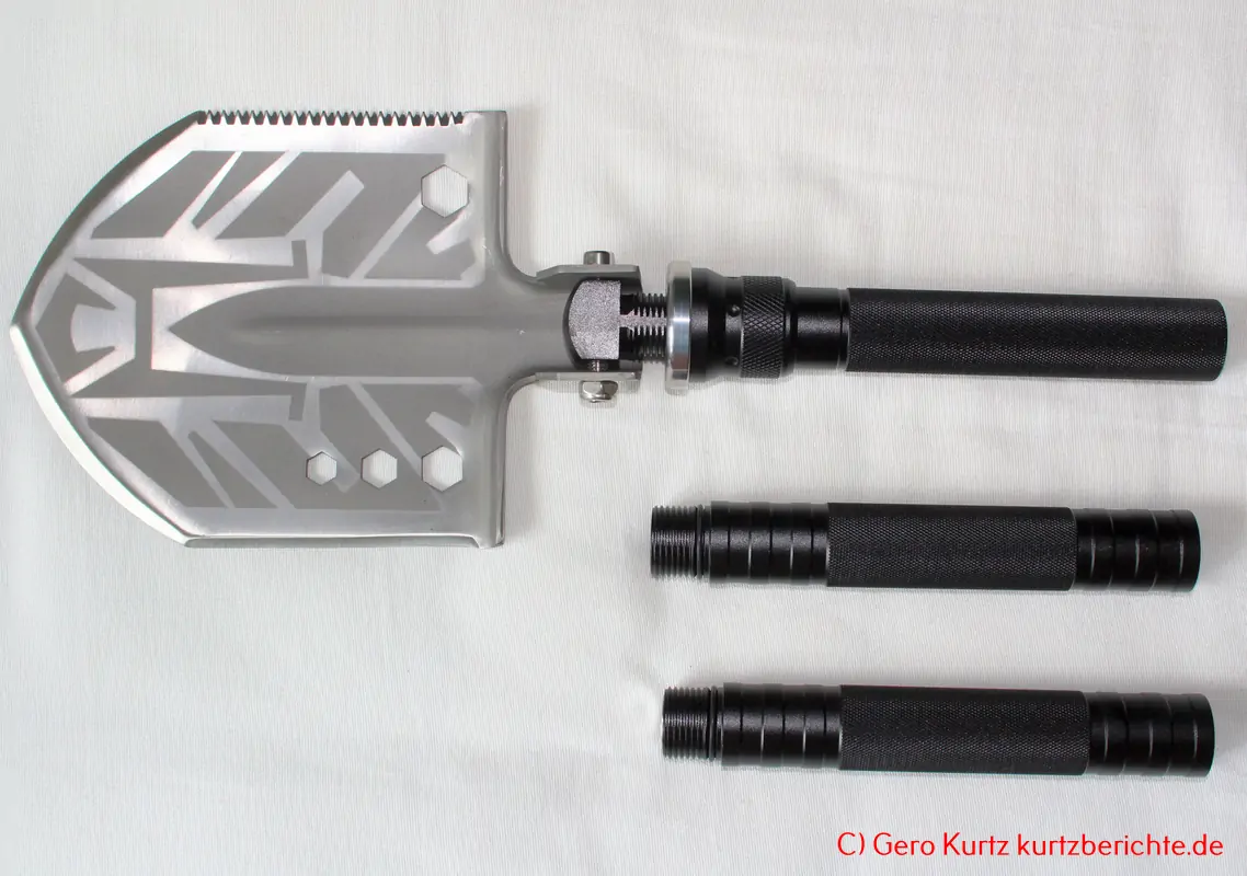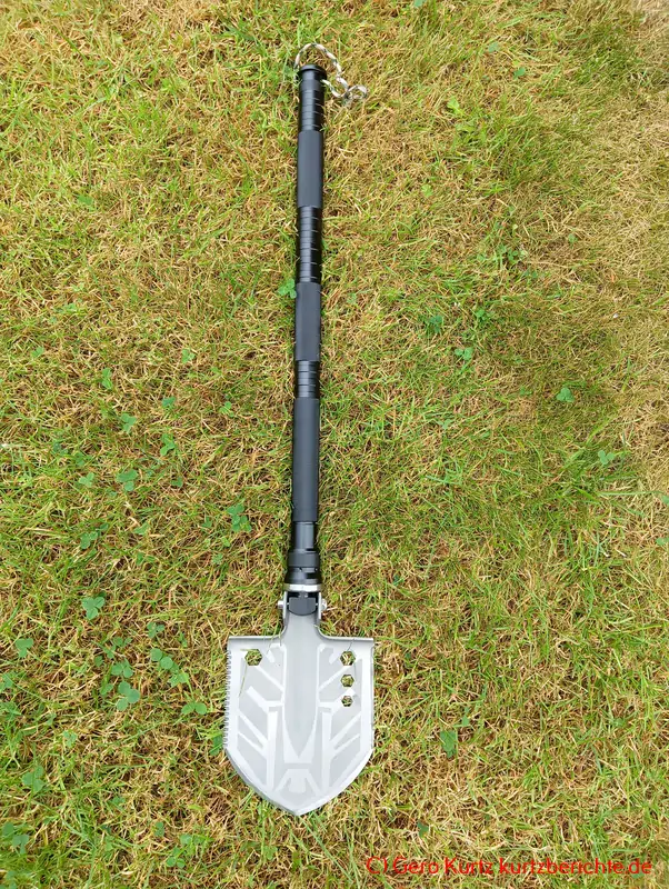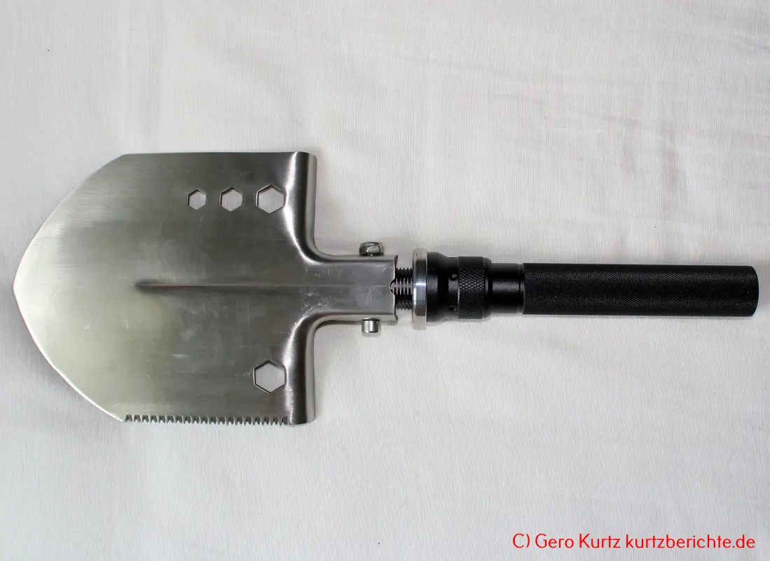 Im Inneren gibt es dann noch zusätzliche Utensilien, wie eine praktische Notpfeife, Säge, Schraubendreher und einen Feueranzünder. Für das Auto gibt es auch noch eine Spitze, damit im Notfall die Fensterscheiben eingeschlagen werden können. Damit gibt es viele mögliche Einsatzgebiete für den Spaten wie Camping, Gartenarbeit, Friedhof, Schatzsuche, Überlebenssituationen oder Fahrzeugausrüstung.