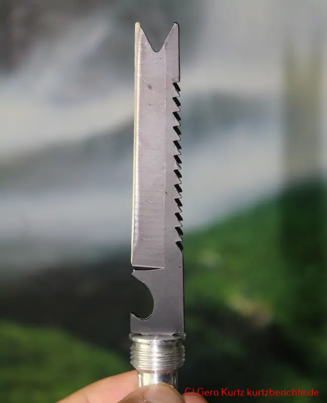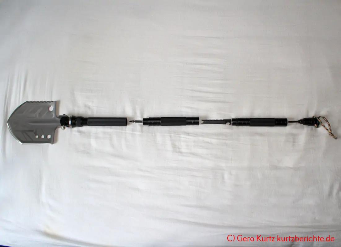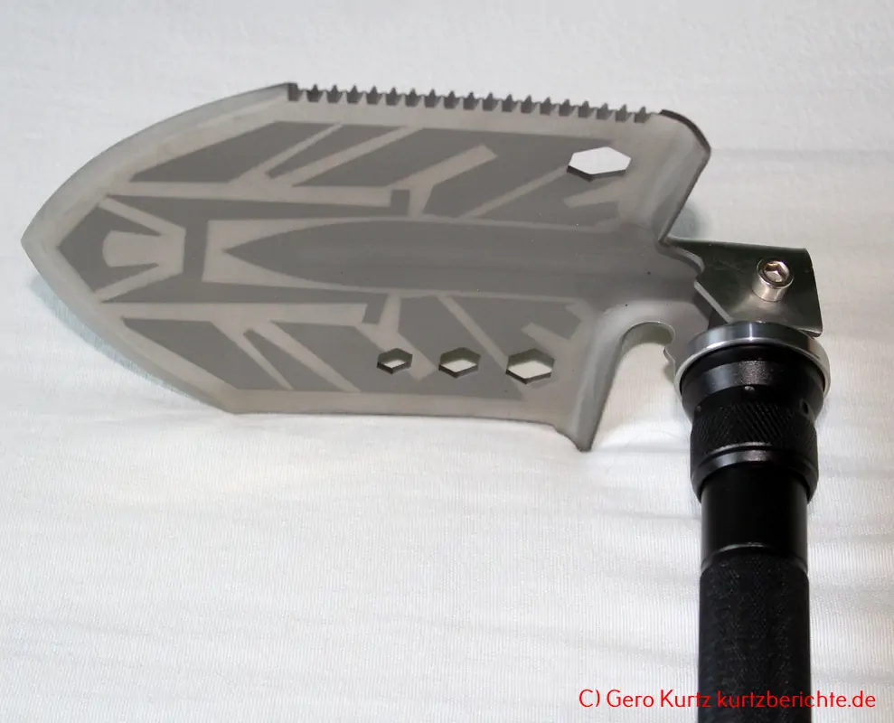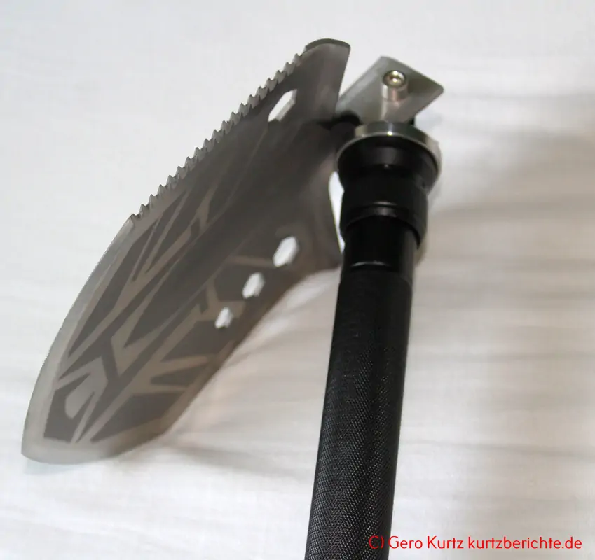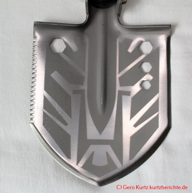 Im Inneren gibt es dann noch zusätzliche Utensilien, wie eine praktische Notpfeife, Säge, Schraubendreher und einen Feueranzünder. Für das Auto gibt es auch noch eine Spitze, damit im Notfall die Fensterscheiben eingeschlagen werden können. Damit gibt es viele mögliche Einsatzgebiete für den Spaten wie Camping, Gartenarbeit, Friedhof, Schatzsuche, Überlebenssituationen oder Fahrzeugausrüstung.