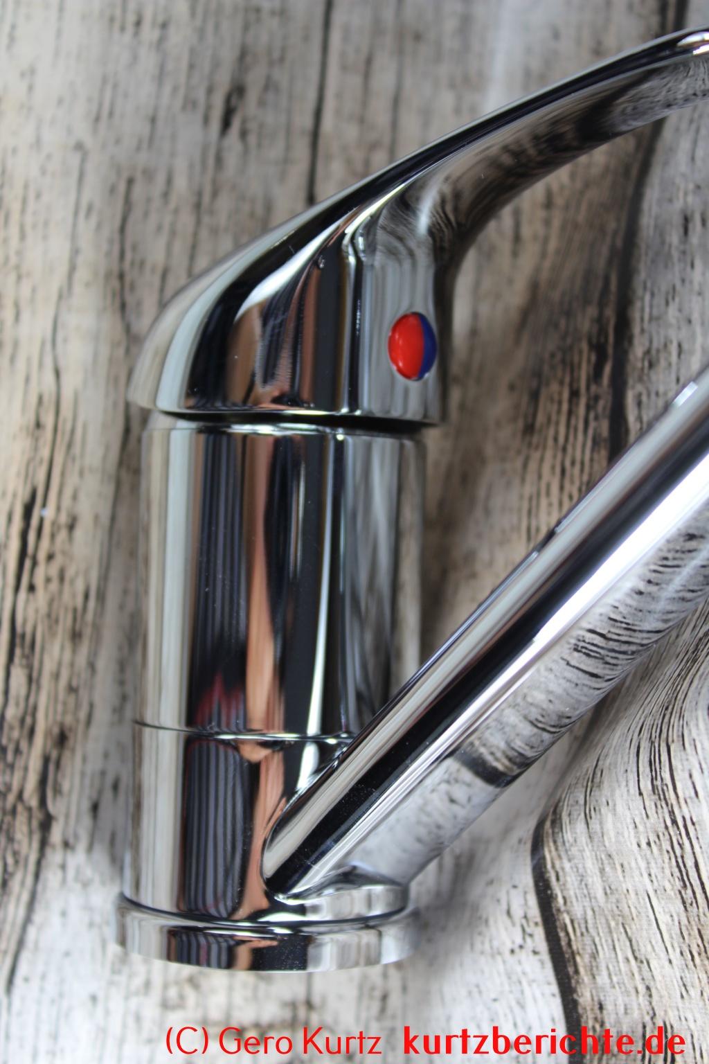 Bis zum Armaturenhebel sind es etwa 7,5 cm und bis zur Spitze des Hebels (voll geöffnet) ca. 15 cm. Unter dem Hebel befindet sich die Kennzeichnung rot und blau für die Wassertemperatur, je nach Drehrichtung. Der Auslauf besitzt vorn einen Standardperlator für einen 22er-Schraubenschlüssel. Die Höhe des Auslaufs bis zur Basis beträgt etwa 15 cm.