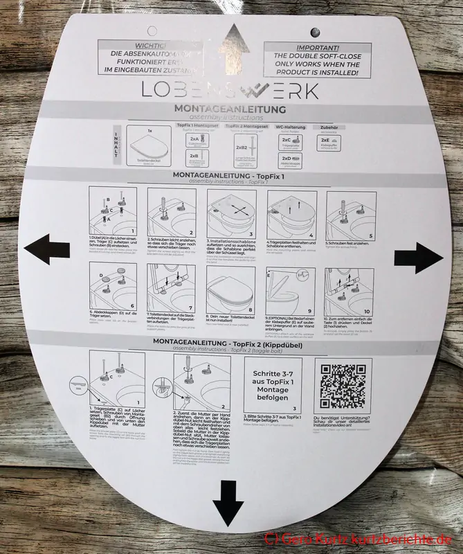 Der Toilettendeckel kann wahlweise mit normalen Dübeln oder mit Kippdübeln angebracht werden. Die genaue Anleitung befindet sich auf der Installationsschablone in deutscher Sprache. Bei Bedarf gibt es auch ein entsprechendes Video, welches über den QR-Code abgerufen werden kann.
