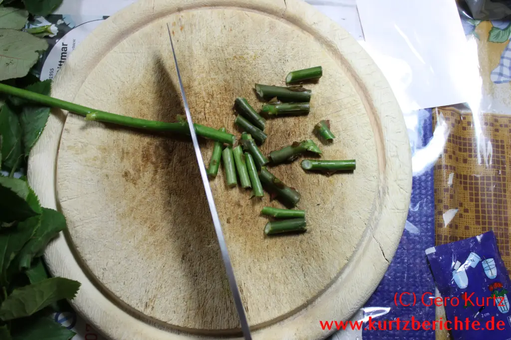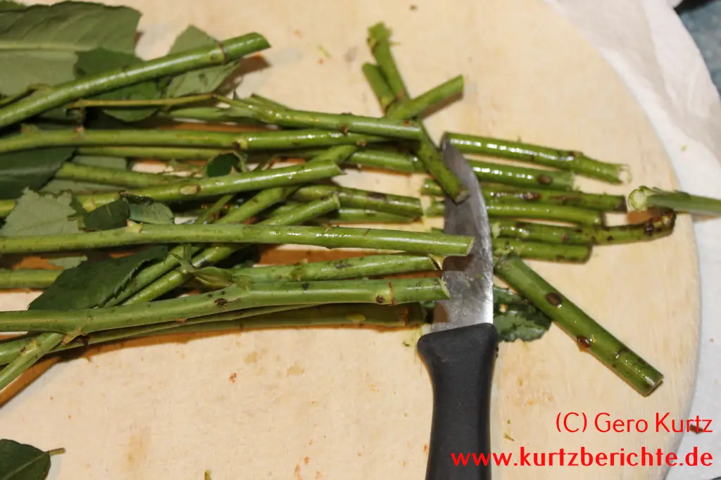 Bei den Rosen, diese entsprechend vorbereiten. Die Blätter bis auf die oberen entfernen und die Stile mit einem scharfen Messer unten möglichst schräg abschneiden.