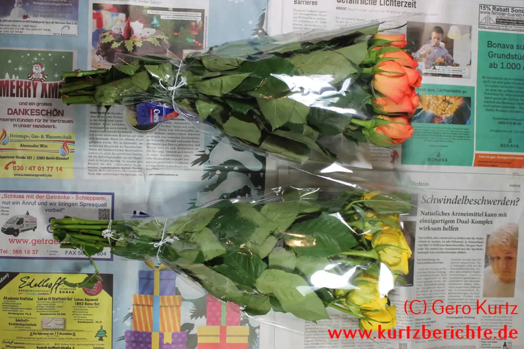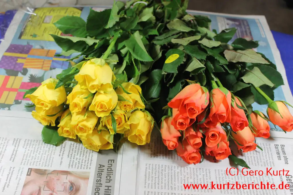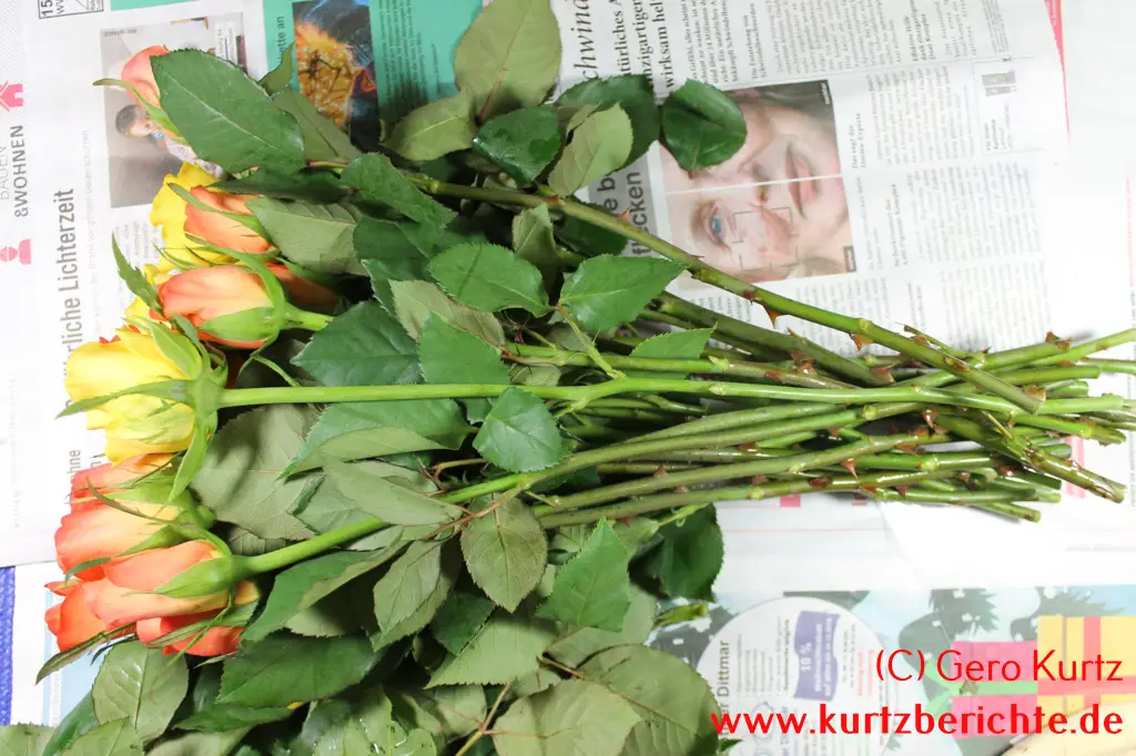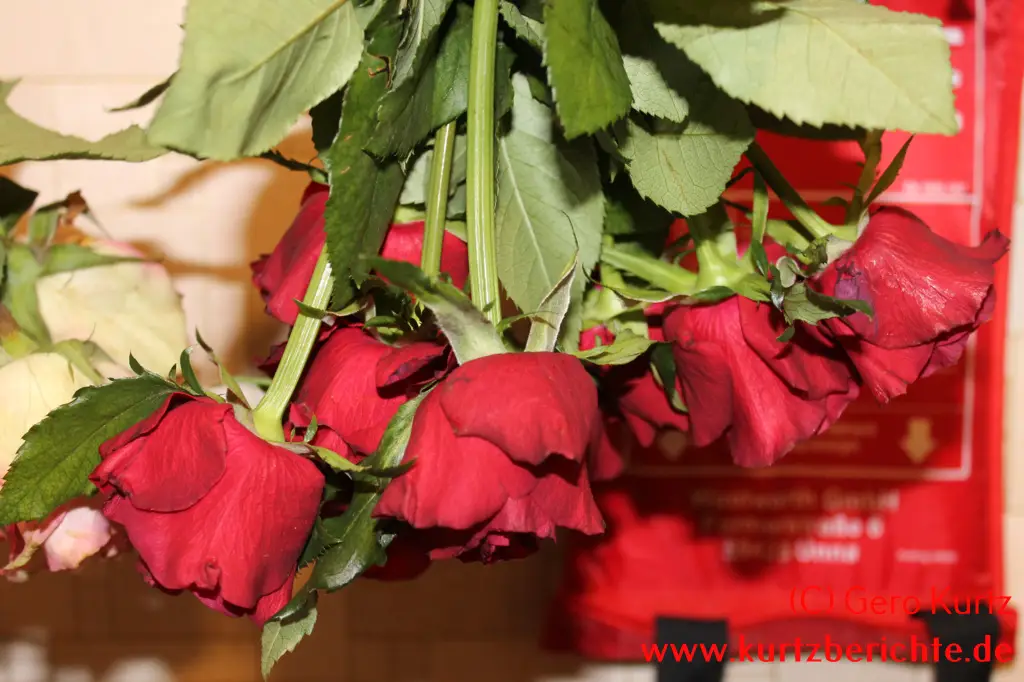 Zuerst besorgen wir uns die passenden Blumen. Wie zuvor besprochen, die Stiele sollten verholzt sein. Rosen wären okay, Tulpen sind nicht geeignet. Ich habe es jetzt mal mit zwei Sträußen Rosen ausprobiert.