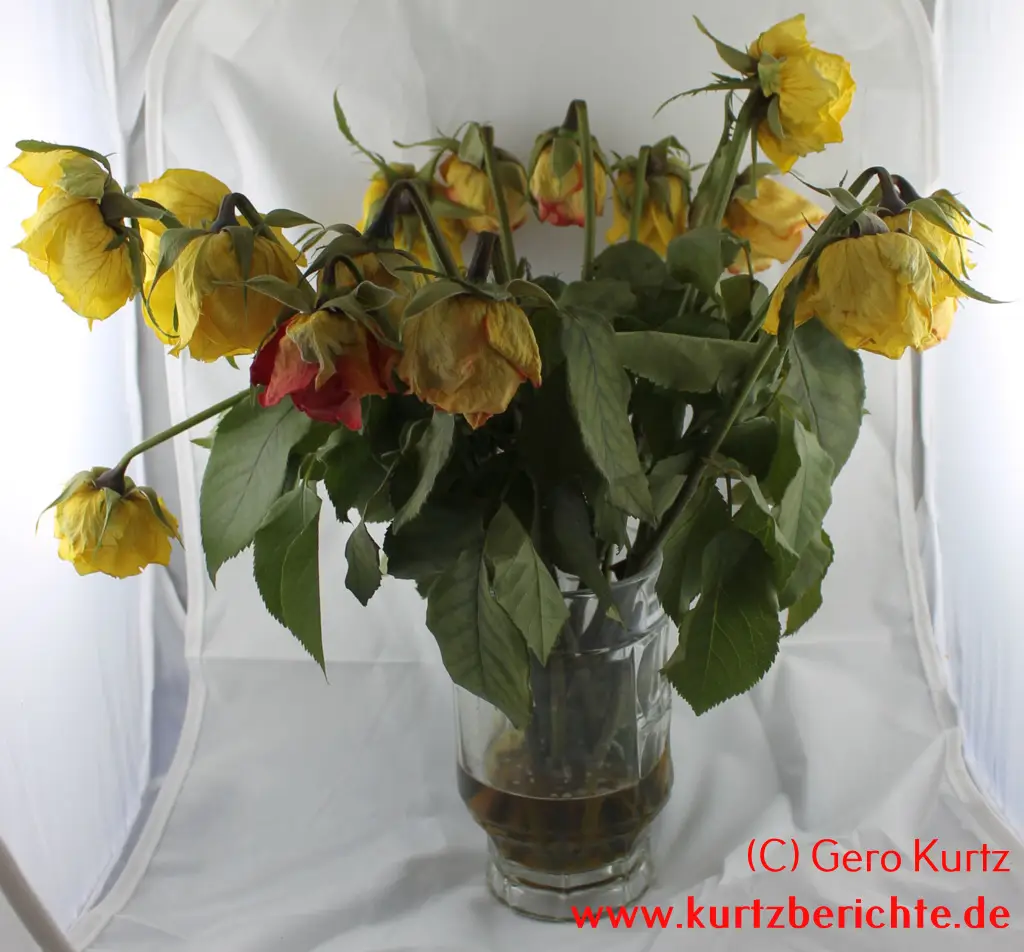 Wie oben ausgeführt, habe ich die Rosen die Glycerin-Wassermischung gestellt und dann gewartet, was passiert. Nach etwa einem Tag fängt das Gemisch an zu wirken. Die Blätter fangen an zu hängen und wenig später leider auch die Rosenköpfe. Nach einigen Empfehlungen im Internet soll man die Rosen bis zu vier Wochen in dem Glycerin-Wasser Gemisch stehen lassen. Das habe ich auch gemacht. Das Ergebnis ist allerdings unbefriedigend. Die Rosen ließen alle ihre Köpfe hängen. Die Farben der Rosen sind nicht erhalten geblieben und einem einheitlichen Gelbton gewichen. Das Wasser-Glycerin Gemisch fing nach einiger Zeit an zu gammeln und zu stinken. An den Blütenblättern konnte ich auch keine Silikontröpfchen feststellen. Die Blätter der Rosen sind grün geblieben, die Stiele ebenfalls. Alles blieb beweglich, also zerfällt nicht beim Anfassen. Die Blütenblätter sind trocken und sind ebenfalls bis zu einem gewissen Grad geschmeidig.