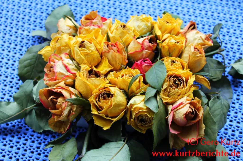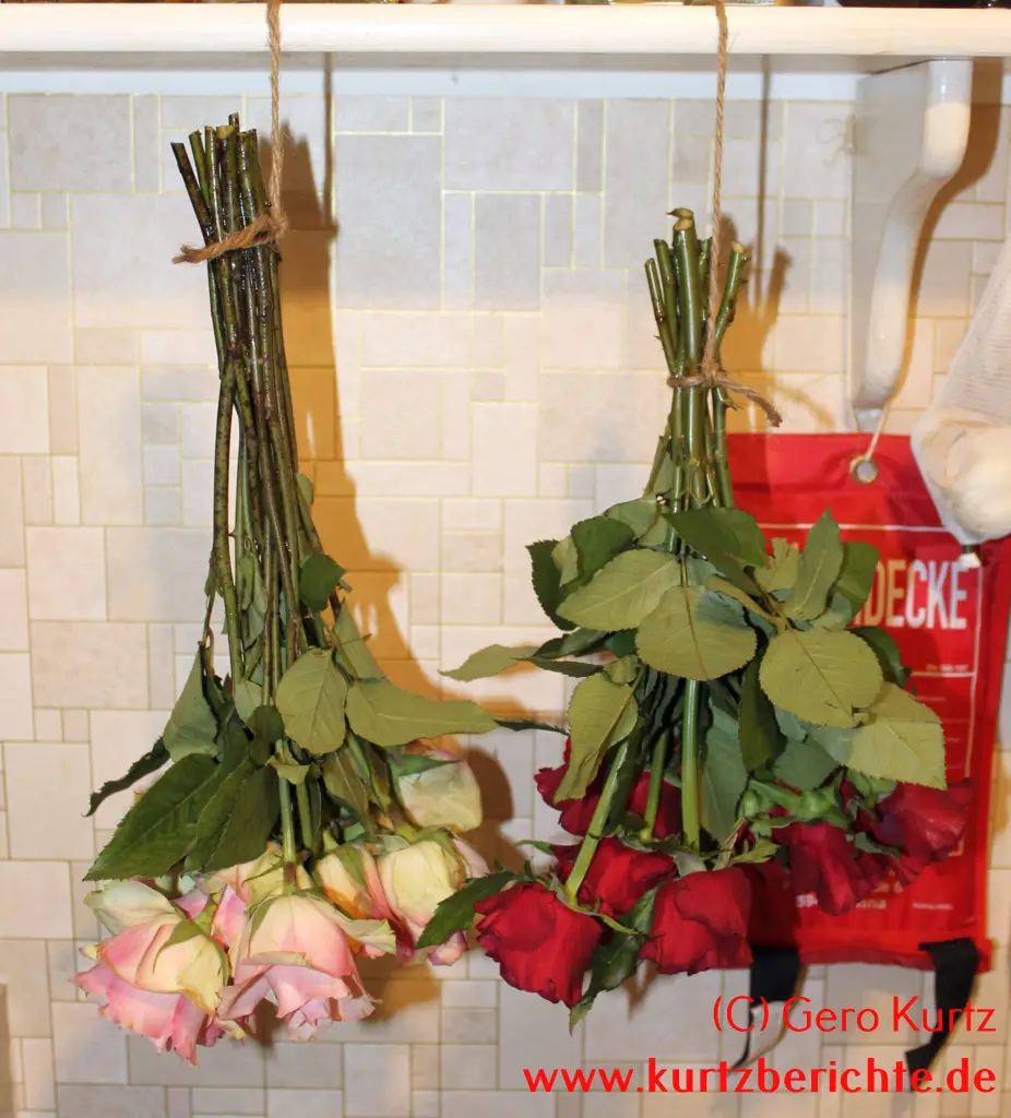 ... Jetzt ist ein wenig Zeit vergangen und ich kann Euch die Ergebnisse berichten. Wie schon vorher geschrieben, habe ich dieses Mal die Rosen nur etwa 5 Tage im Glycerin Gemisch belassen. Dann habe ich sie herausgenommen und kopfüber in meiner Küche aufgehängt. Dort habe ich sie etwa 14 Tage "reifen" lassen. Danach habe ich sie losgebunden und das Ergebnis begutachtet.