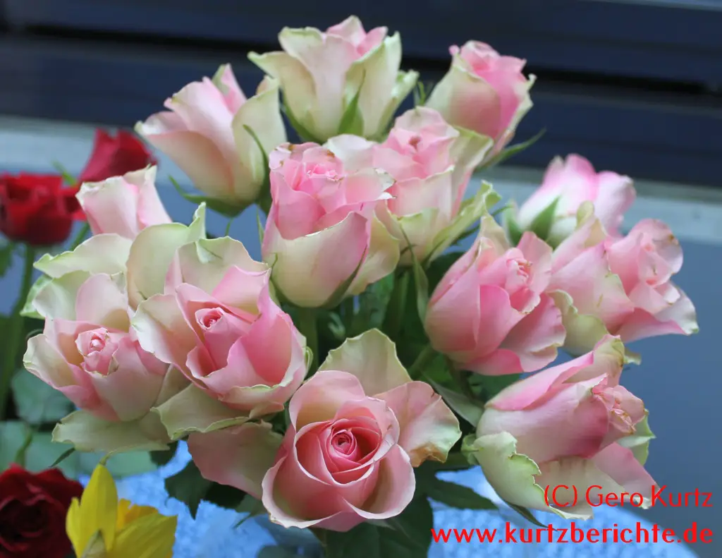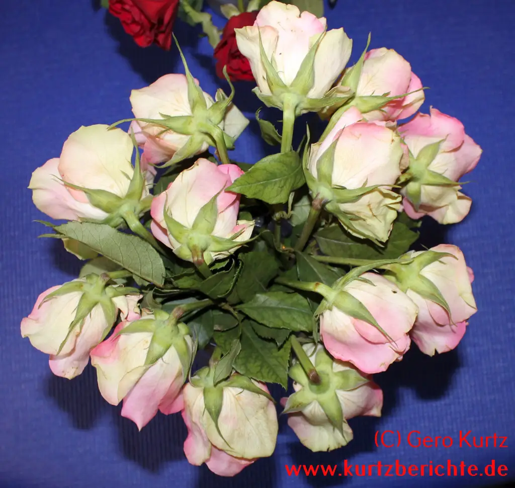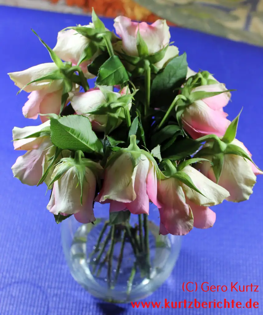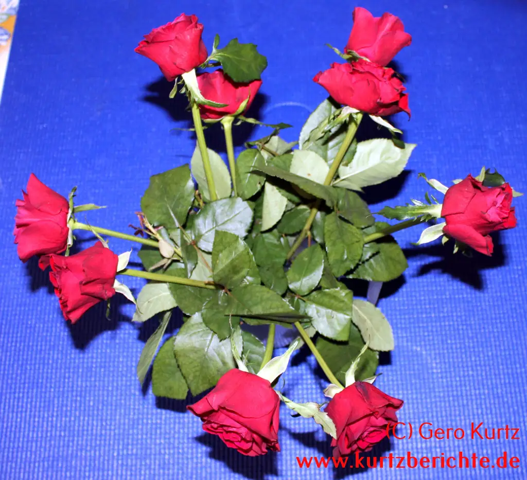Es ist anscheinend wichtig, bereits bei der Auswahl der Rosen besondere Sorgfalt walten zu lassen. Auf jeden Fall ist es von Vorteil, dass die Rosen sehr starke Stiele haben, damit sie später nicht so doll die Köpfe hängen lassen. Aber auch vor allem sollten sie frisch sein und nicht schon vorher angewelkt.