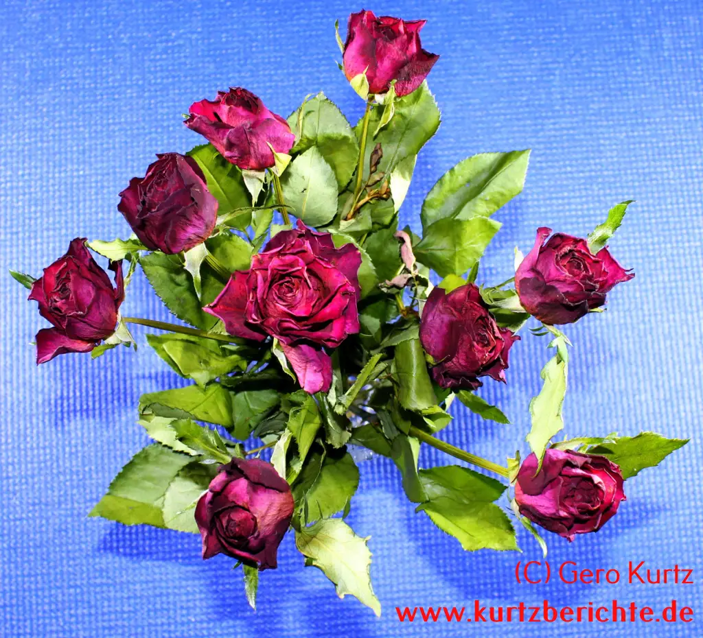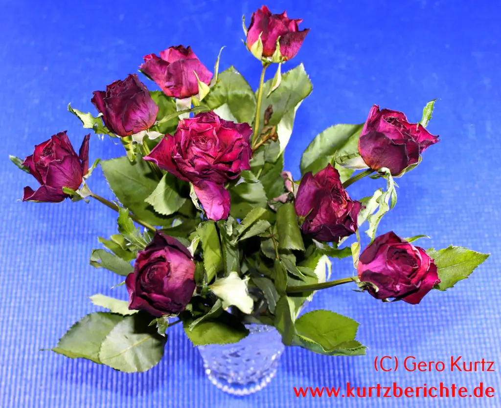 Das mit der Trocknung mit Glycerin funktioniert. Auf keinen Fall aber die Rosen länger als 5 Tage im Glycerin-Wassergemisch stehen lassen. Danach noch weiter trocknen lassen. Und nur Rosen bzw. Blumen mit harten Stielen verwenden, sonst kippt die Blüte einfach um.