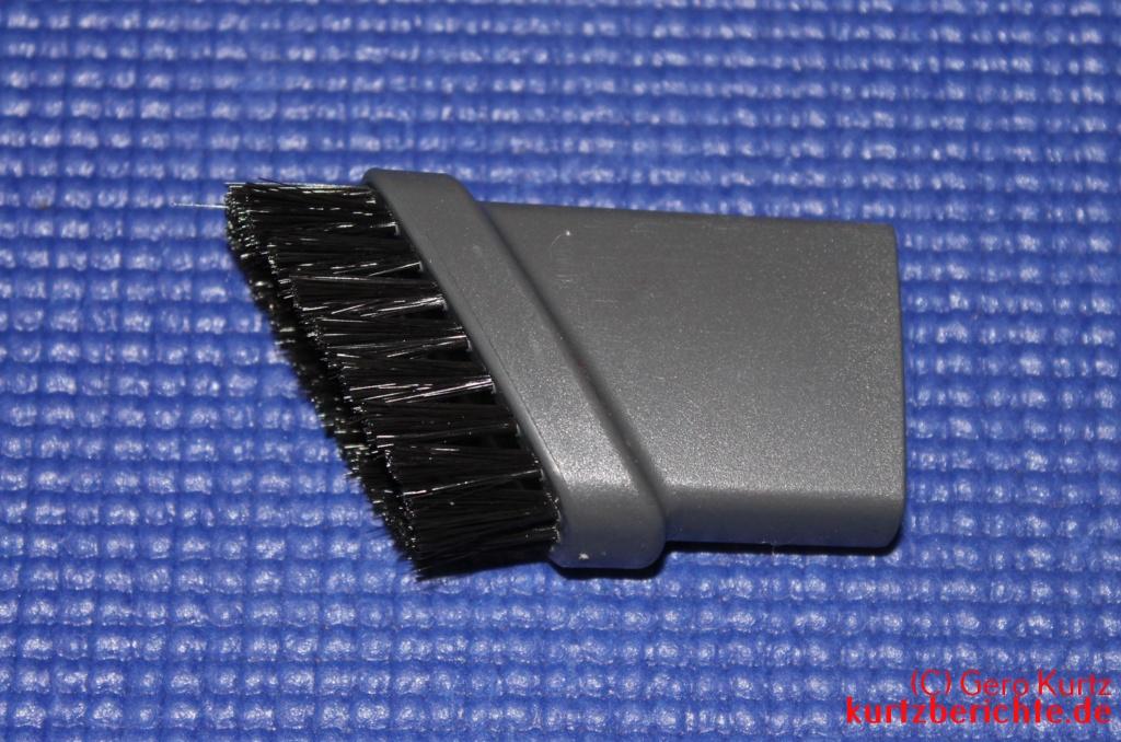 Saugpinsel: Ist etwa 5 cm breit und leicht abgeschrägt. Vorne befindet sich zwei Reihen etwa 2 cm lange Pinsel. Dieser kann auf den Plastikadapter des Saugschlauches aufgesetzt werden und dient zum Absaugen empfindlicher Gegenstände wie Radios, Tastaturen oder Telefone.