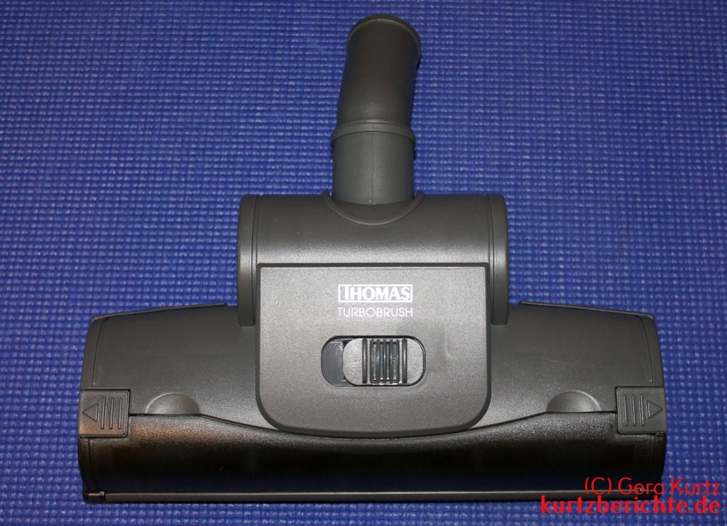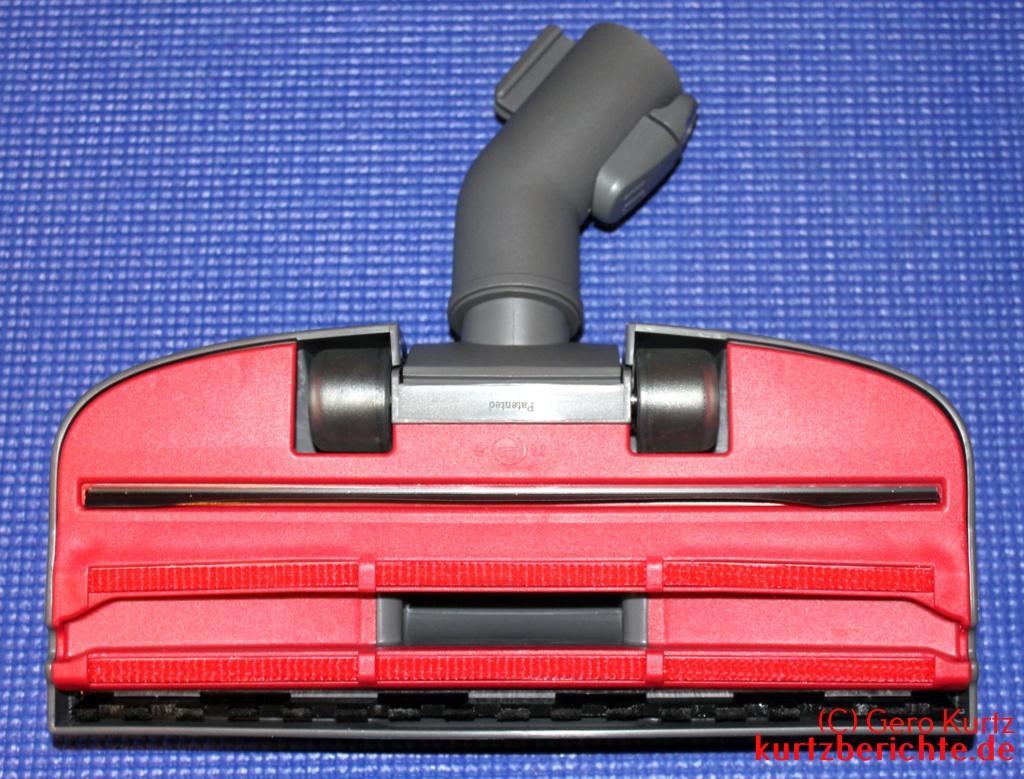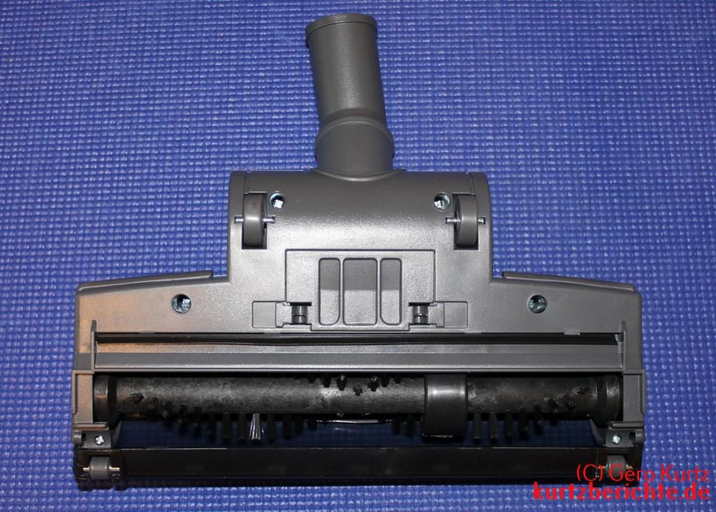 Die Turbodüse hat eine Breite von 28 cm und kann ebenfalls an das Teleskoprohr angeschlossen werden. Auf der Unterseite hat sich eine sich beim Saugen drehende Bürste. Mit dieser können Tierhaare, Fusseln usw. besonders gut aufgenommen werden. Oben befindet sich noch ein Schiebeschalter, um zusätzlich Luft einzulassen.