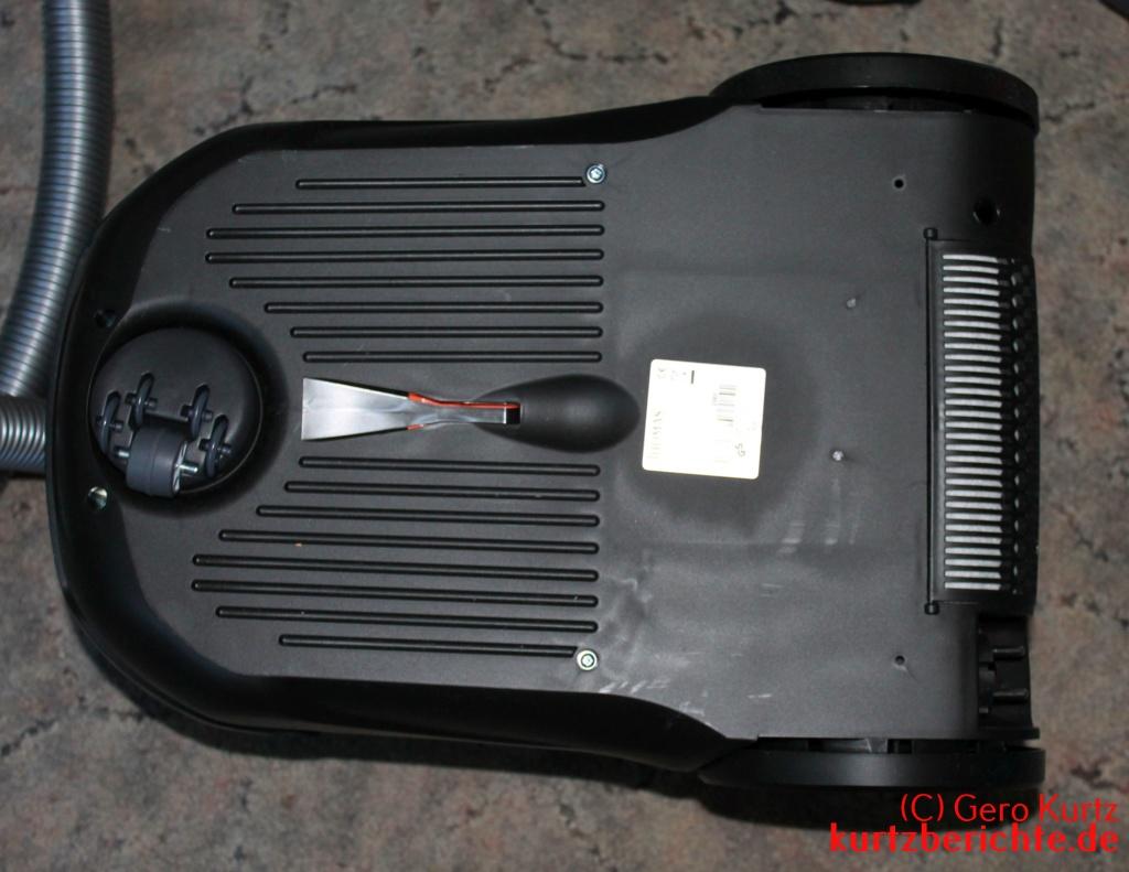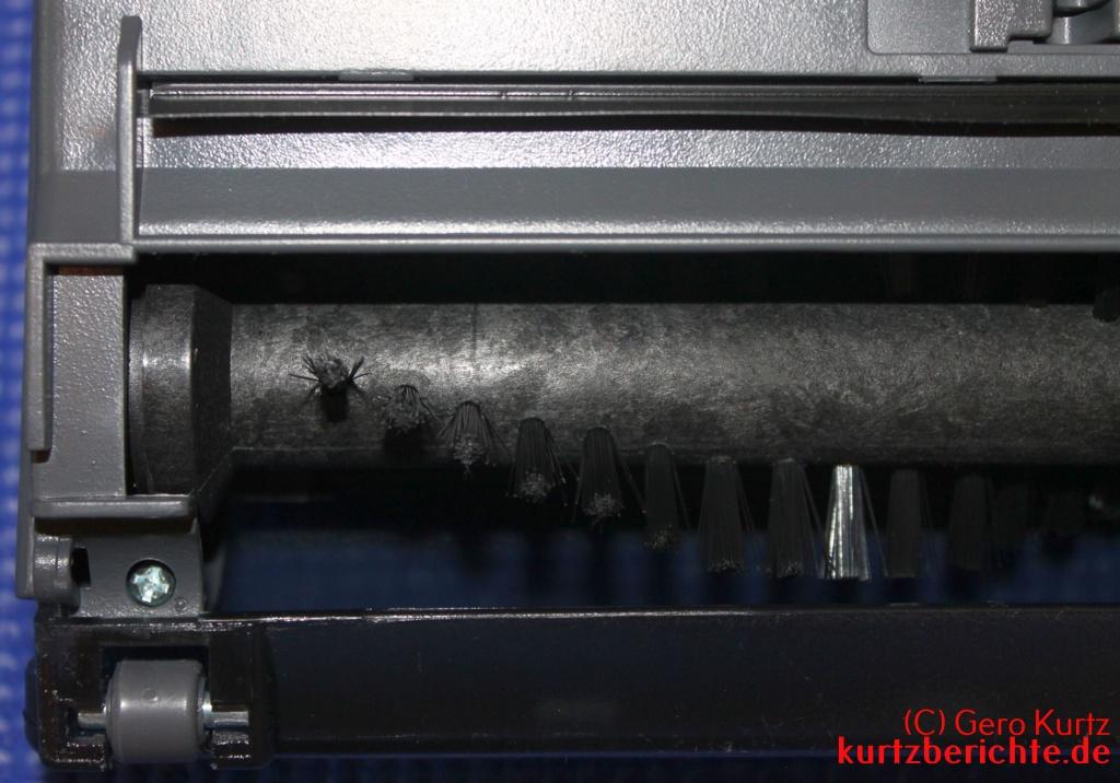 Unten befinden sich zwei Rollen. Außerdem eine Gummilippe, zwei Spezialstreifen für die Fusseln und herausklappbare Pinsel für glatte Böden. Über den Kippschalter links oben kann die Pinselleiste heraus geklappt werden.