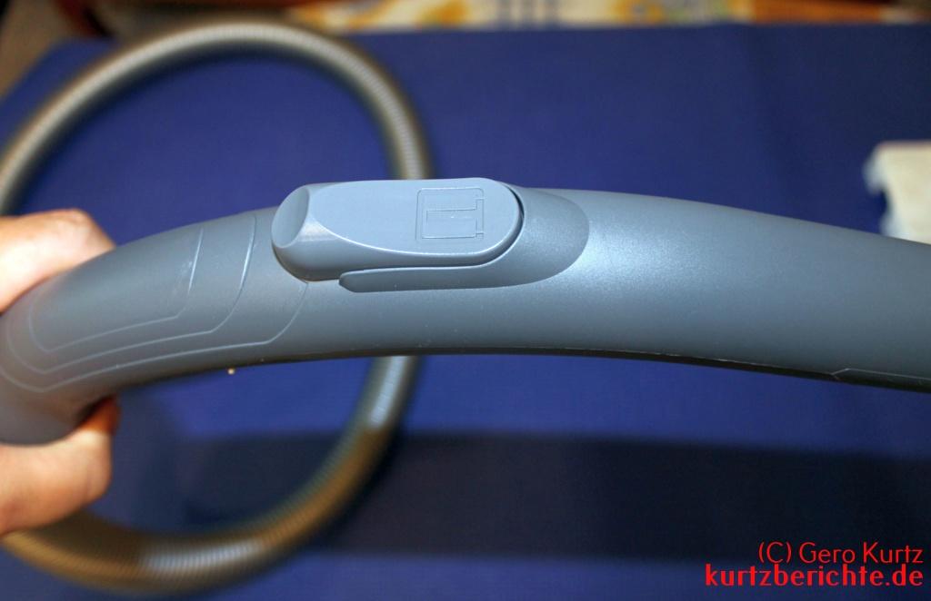 Außerdem gibt es hinten rechts einen grauen Knopf mit einem weißen Strich in der Mitte. Mit diesem kann man den Staubsauger anmachen bzw. die Saugstärke in vier Stufen regulieren. Die Saugstärke wird durch drei LEDs unterhalb des Knopfes angezeigt. Drückt man länger auf den Knopf wird das Gerät abgeschaltet.