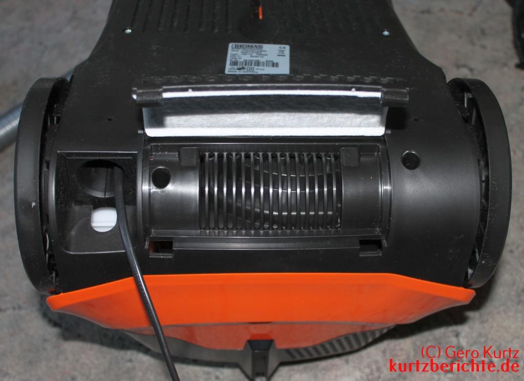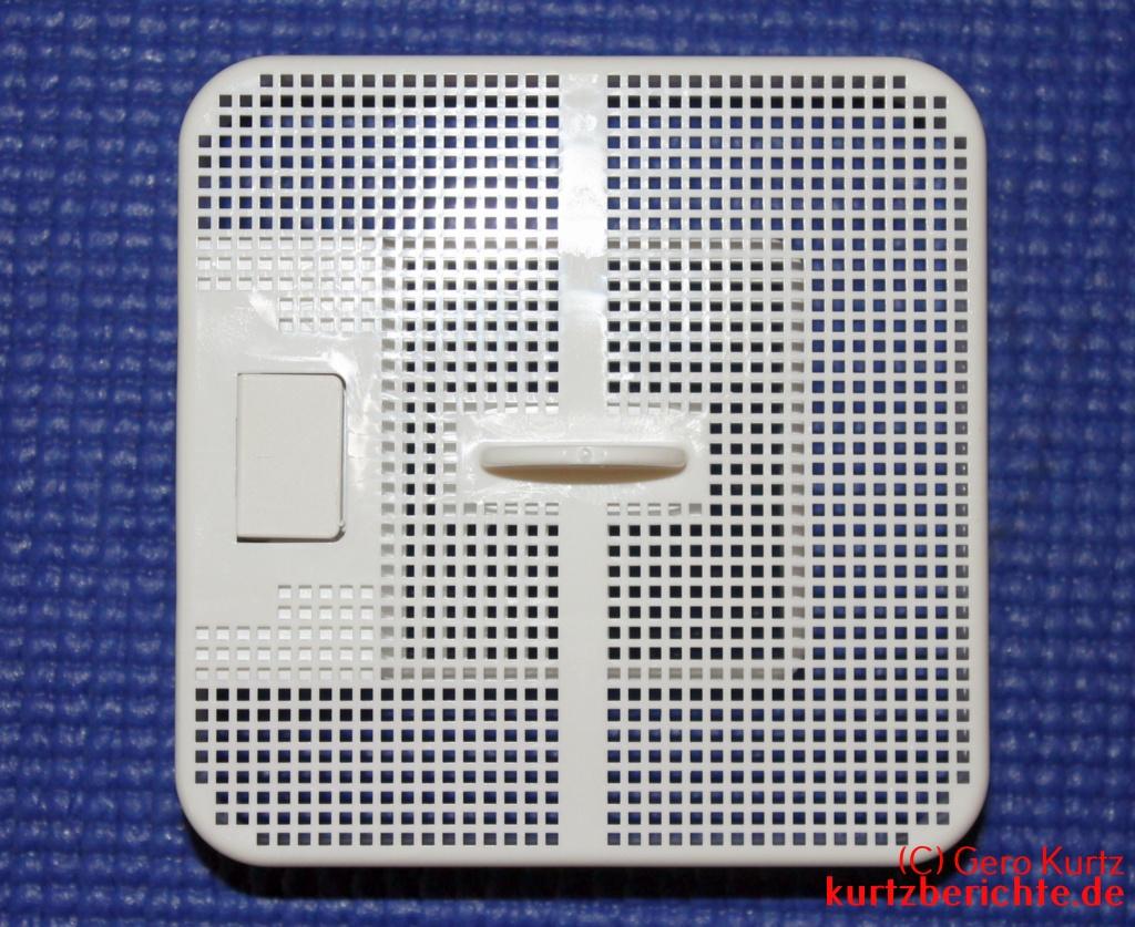 Zwischen den beiden Rädern befindet sich im unteren Bereich eine Klappe mit einem Filter. Dieser wird in der Bedienungsanleitung nicht erwähnt. Der Zweck und das Wechselintervall sind unbekannt.