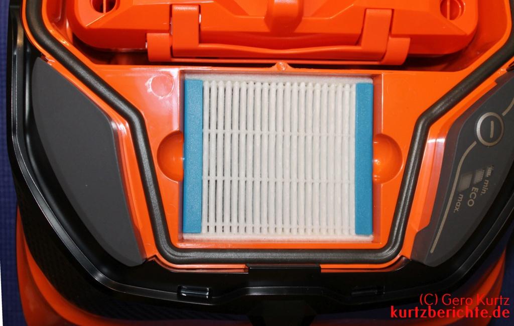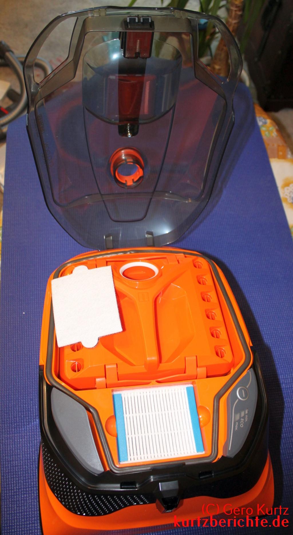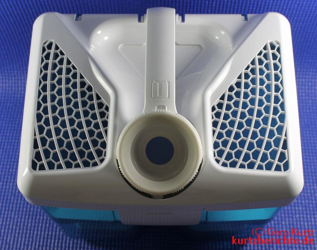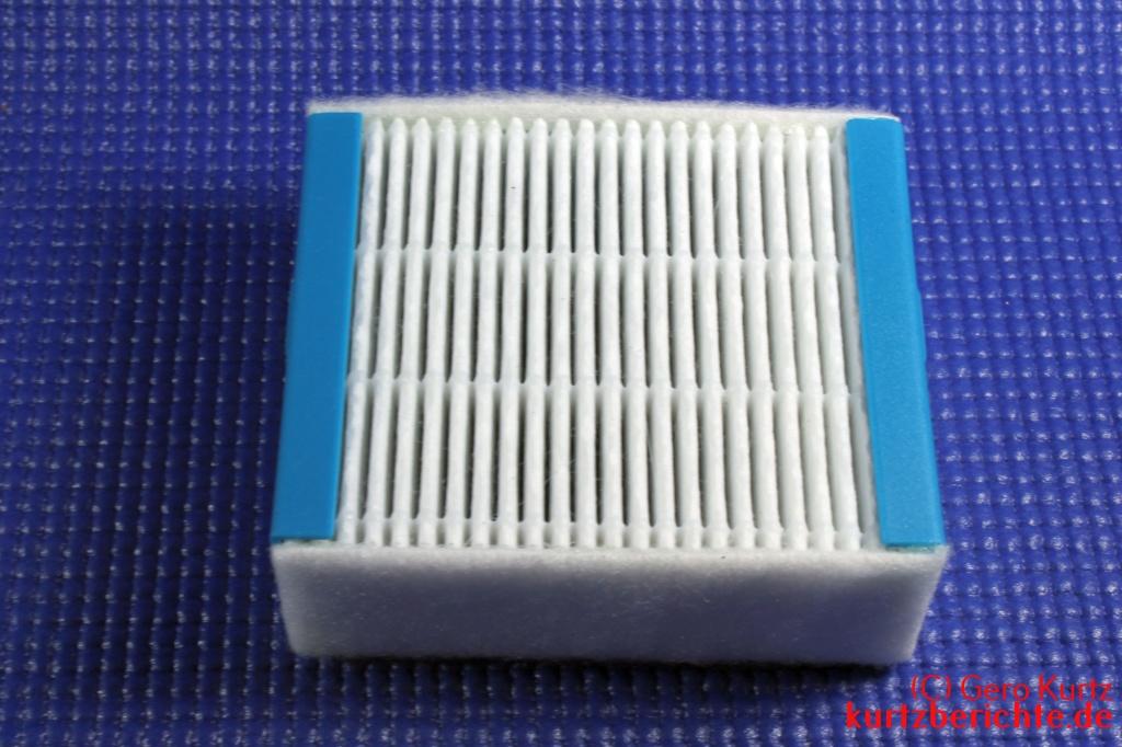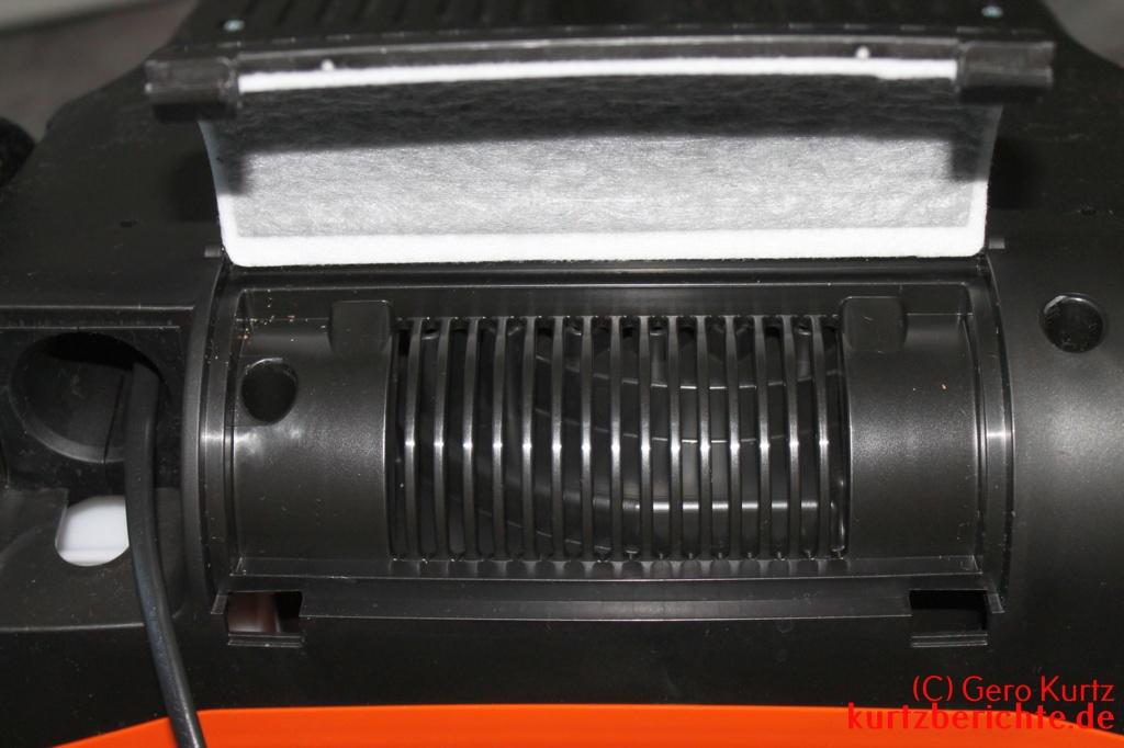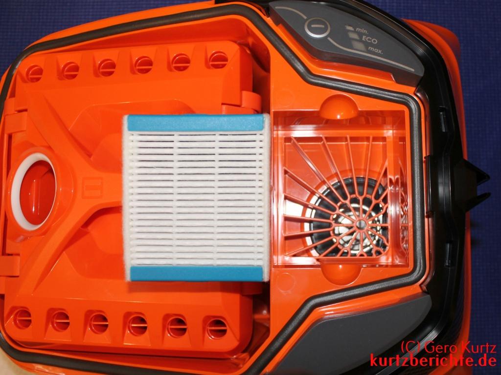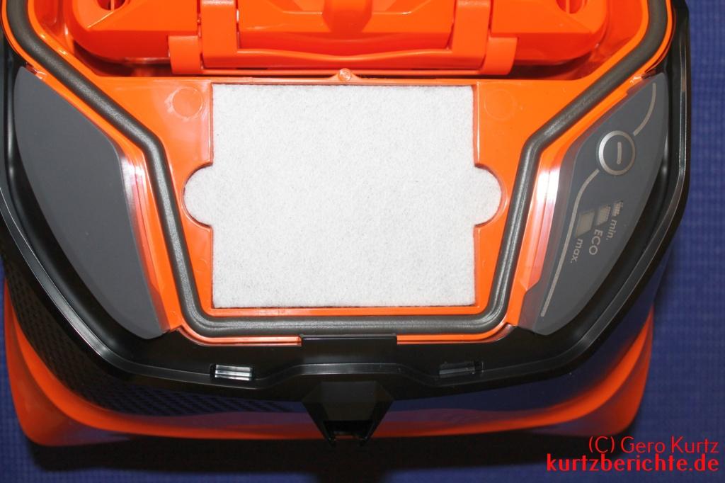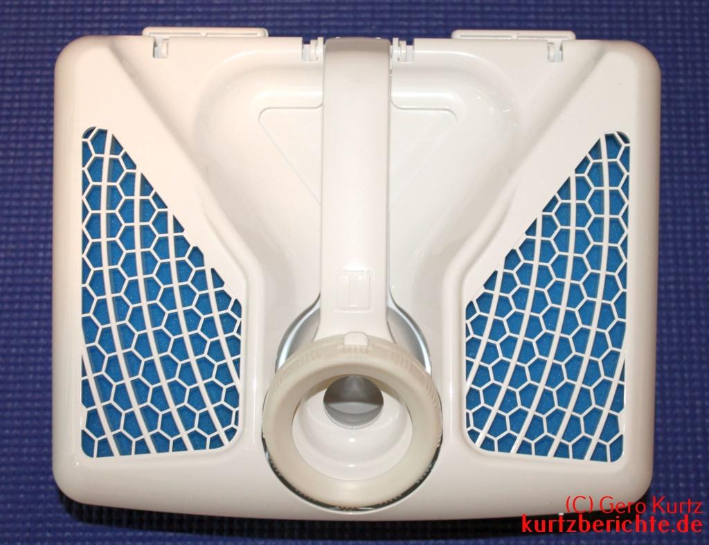 Öffnet man den oberen Deckel dann befindet sich gleich vorne ein Hygienefilter in Form einer Filtermatte (Spezialhygienefilter) und darunter ein Filterkasten (Schaumstoffvorfilter).