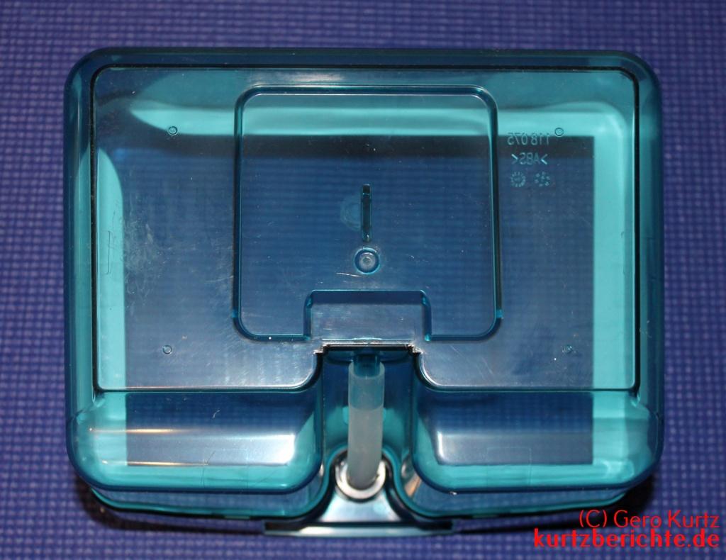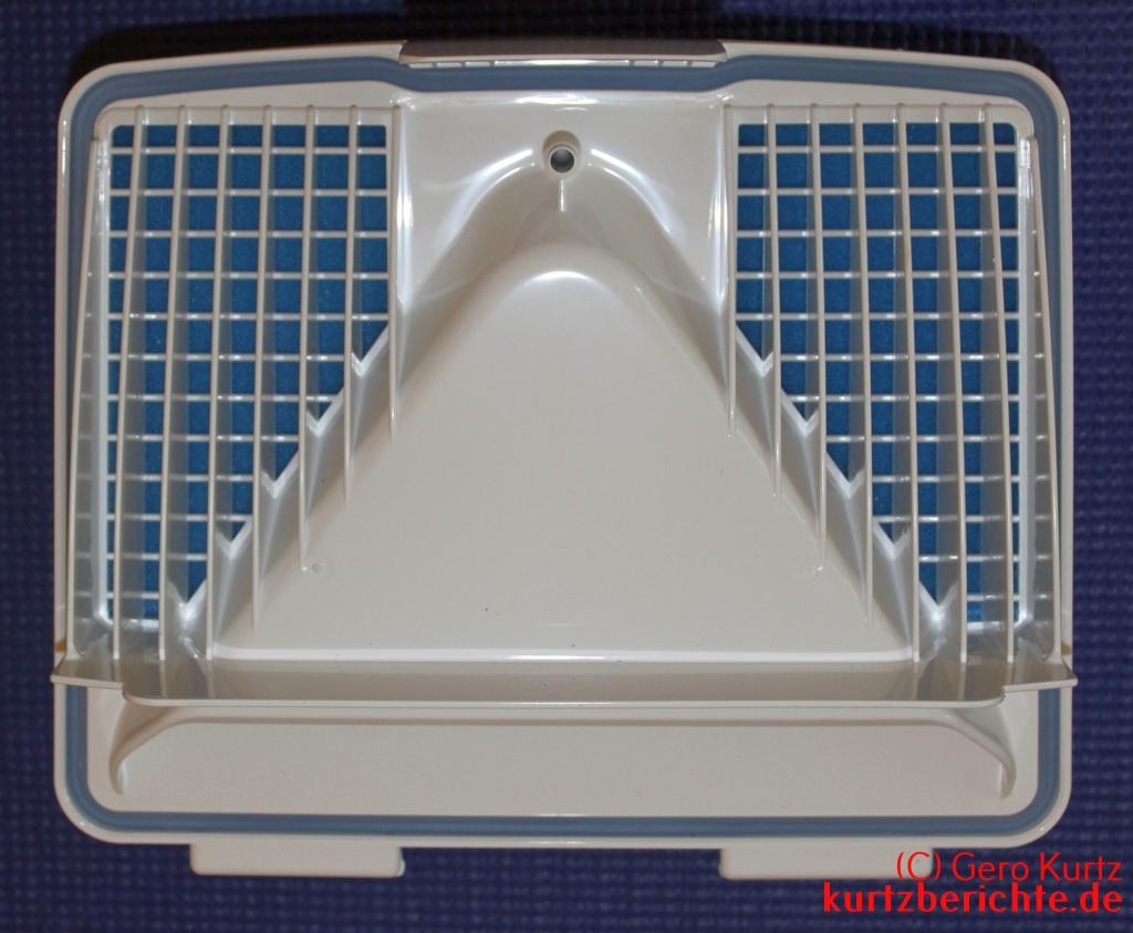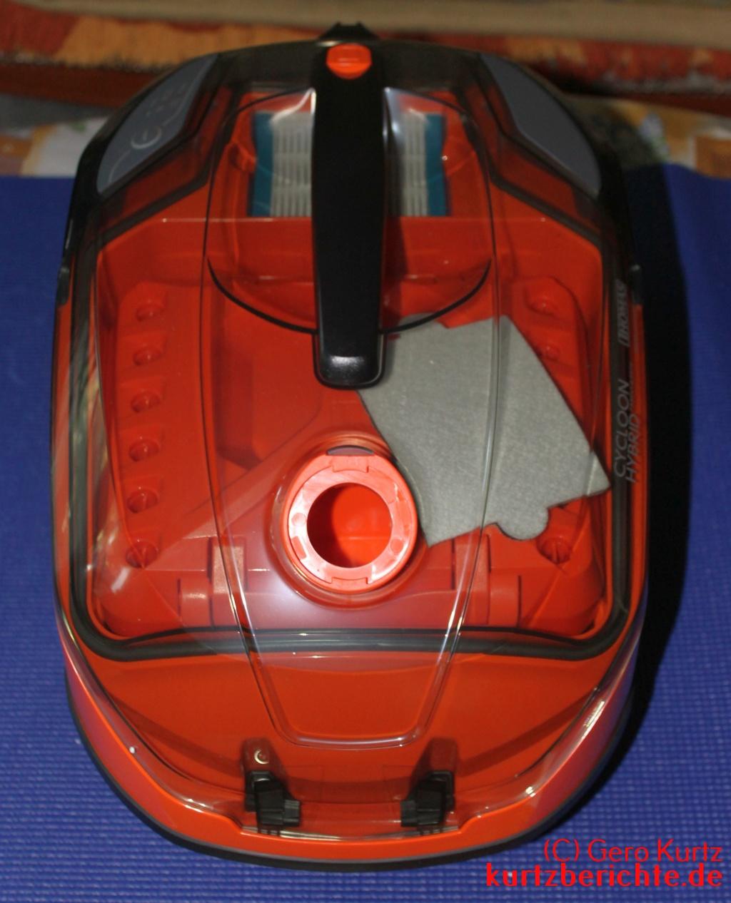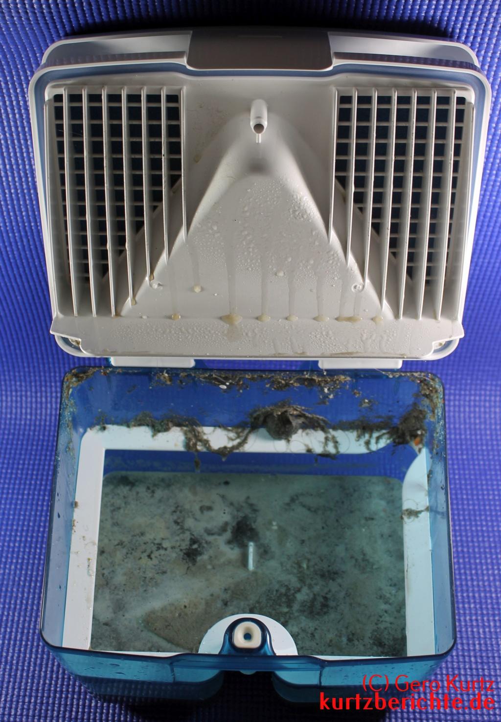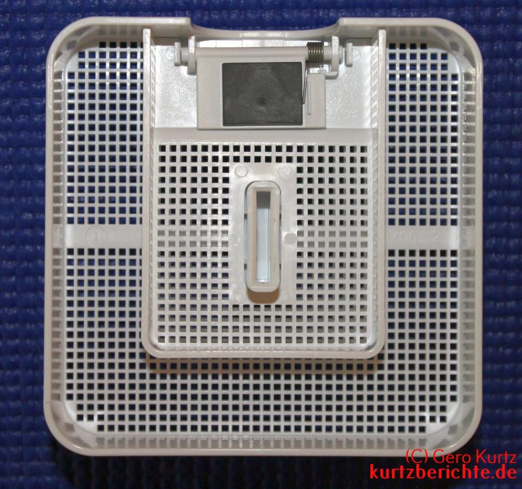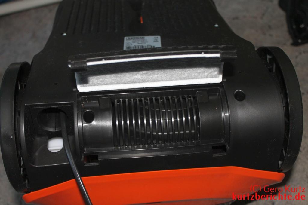 Öffnet man den oberen Deckel dann befindet sich gleich vorne ein Hygienefilter in Form einer Filtermatte (Spezialhygienefilter) und darunter ein Filterkasten (Schaumstoffvorfilter).
