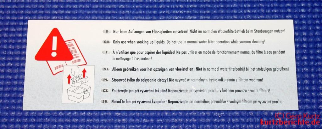 Ab und zu ist es notwendig diesen Filter gründlich mit warmen Spülmittelwasser zu reinigen. Anschließend vollständig trocknen lassen!