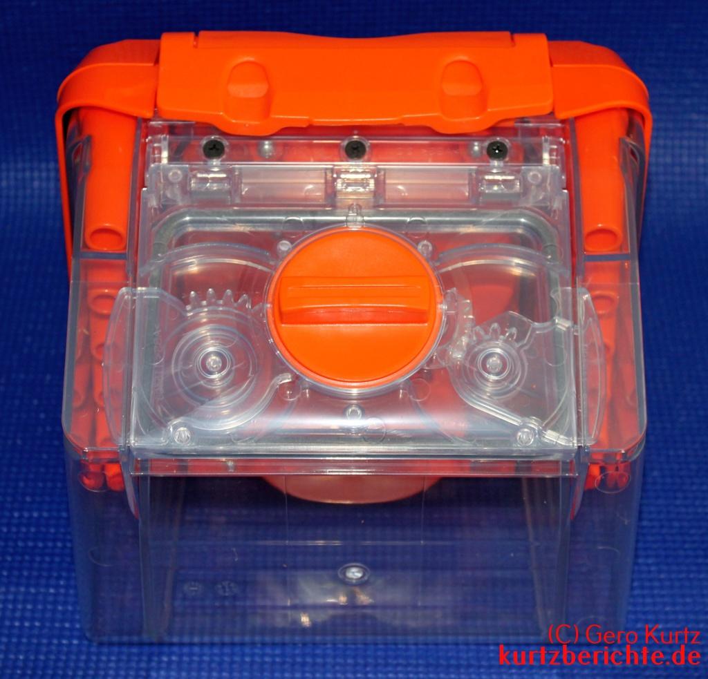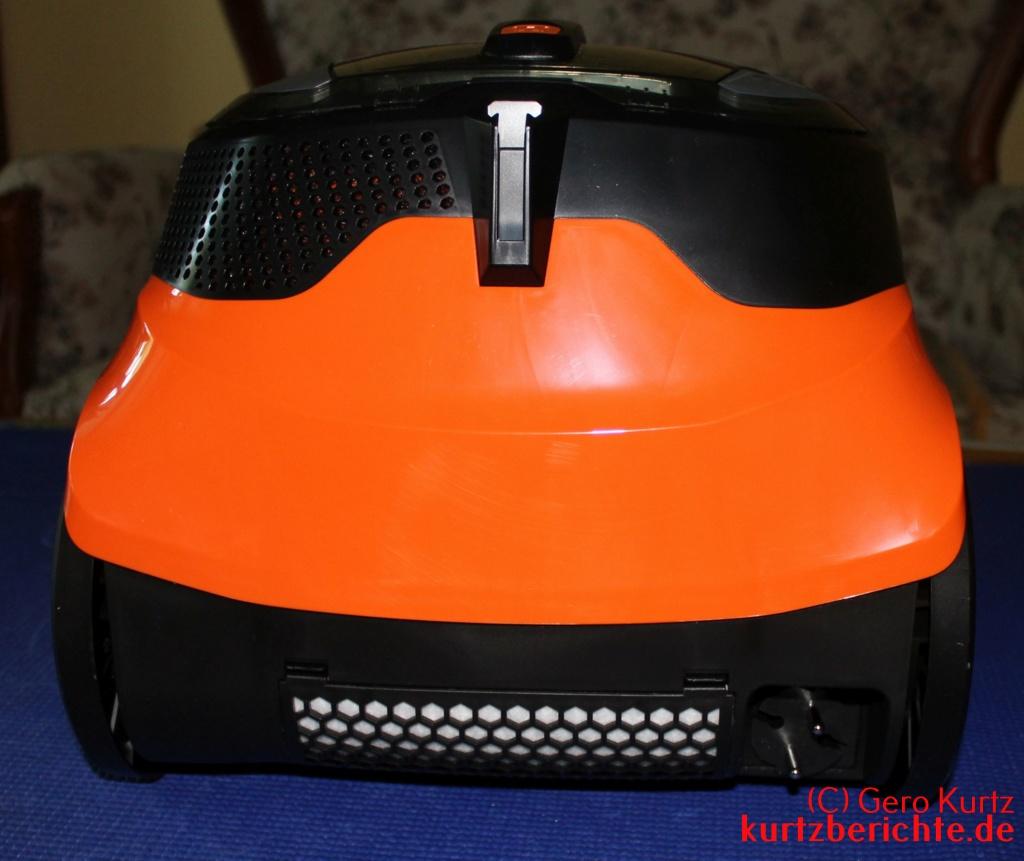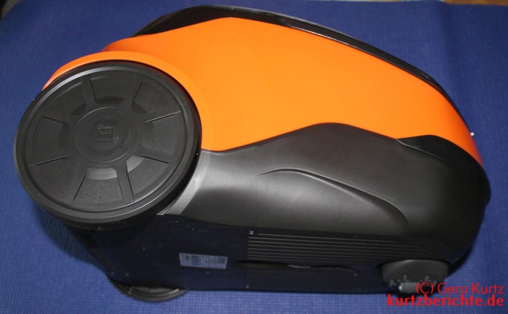 Die Oberseite des Saugers hat einen durchsichtigen Deckel. Auf ihm befindet sich ein Griff mit etwa 22 cm Länge und 3,5 cm Breite. Auf diesem Griff gibt es einen orangen Knopf. Wird dieser gedrückt, dann kann man den durchsichtigen Deckel abnehmen.