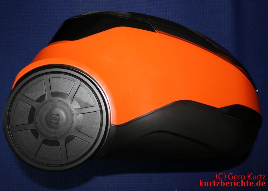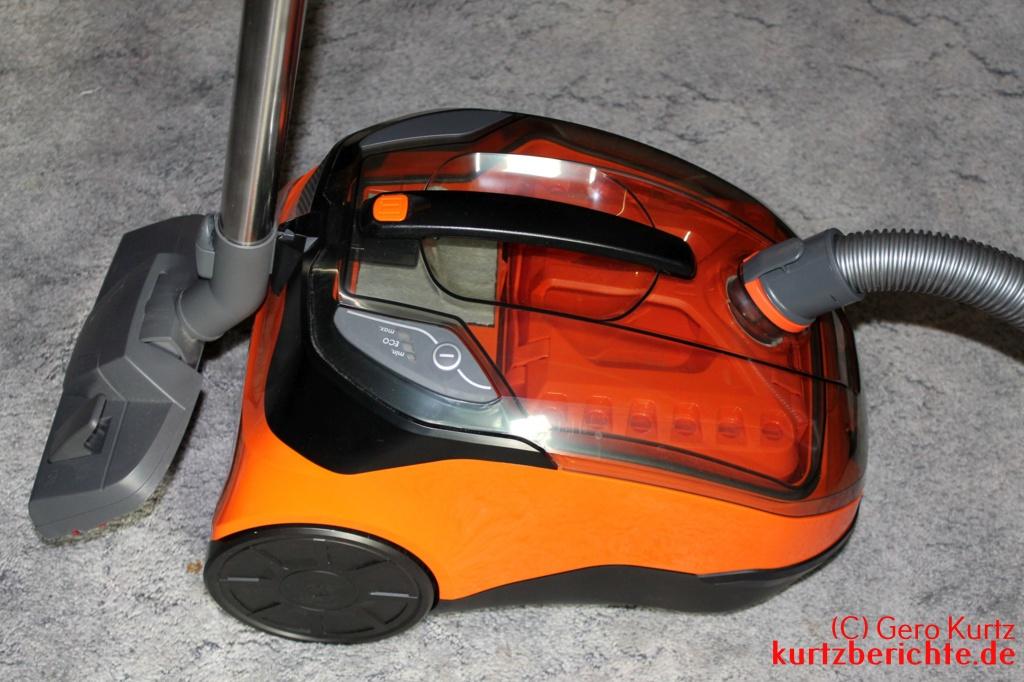 Das Staubsaugergrundgerät hat eine Hülle aus oranger, schwarzer und durchsichtiger Plastik. Es hat ein Gewicht von ca. 7,2 kg.