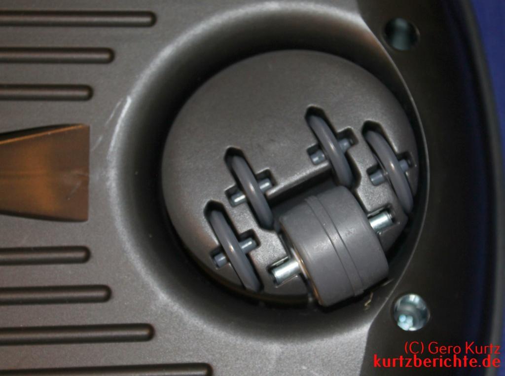 Auf der Unterseite befindet sich vorne in der Mitte ein drehbares Rad.