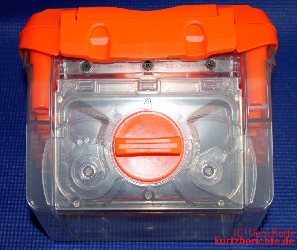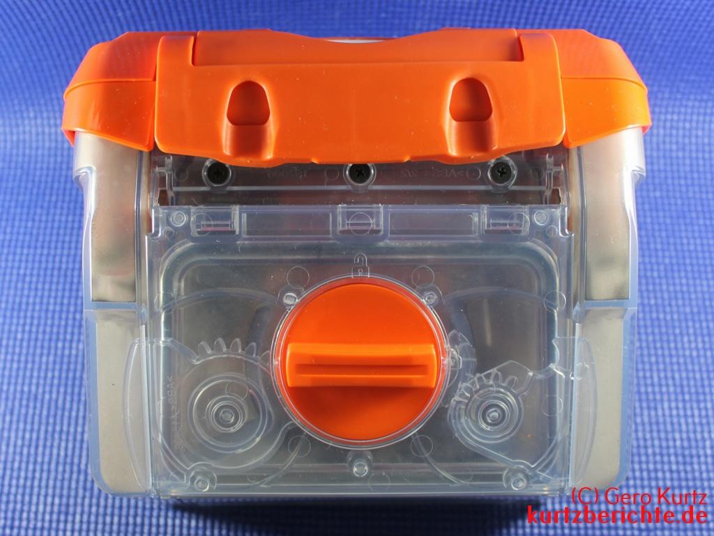 Zyklon easyBox (bereits eingebaut): Diese orange Box befindet sich bereits im Gerät. Hier werden 12 Zyklone (Wirbel) erzeugt und es lagert sich der Staub in der Box an. Diese kann dann einfach durch das Öffnen der Klappe ausgeleert werden.