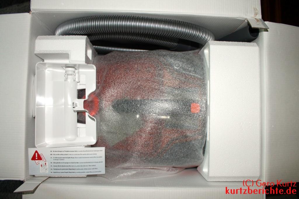Geliefert wird der Staubsauger in einer großen Kiste, welche an den Seiten je eine Einbuchtung zum Tragen hat. Das Gewicht der OVP beträgt etwa 12,8 kg.