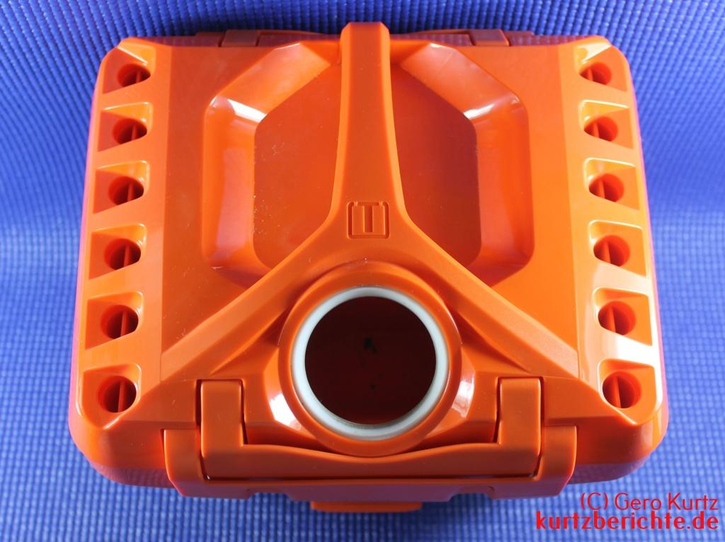 Oben vorne gibt es ein ca. orangen Anschluss. Hier ist es möglich, den beiliegenden Saugschlauch aufzustecken.
