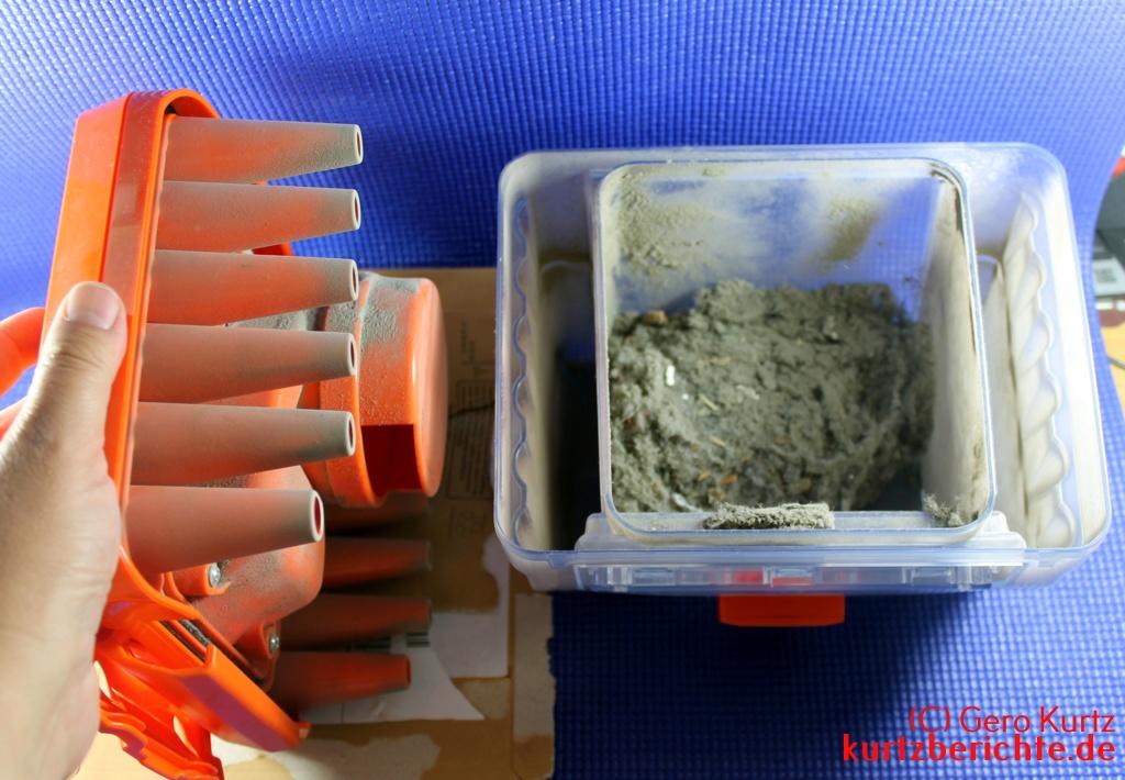 Aber zuerst alles genau entsprechend der Bedienungsanleitung zusammen bauen! Danach entsprechend Wasser bis zur Max-Markierung in den Behälter einfüllen. Diesen in den Staubsauger einsetzen und dann kann das Saugen beginnen. Nach dem Saugvorgang den Behälter entnehmen und was Wasser ausschütten. Am besten draußen über ein Tuch oder so, damit sich der Schmutz absetzen kann. Ins Klo würde ich es nur bedingt schütten, damit dieses nicht verstopft. Insbesondere wenn viele Metallreste, lange Haare usw. im Sauggut sind.