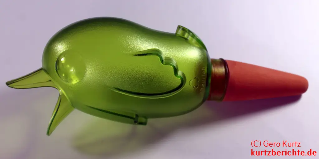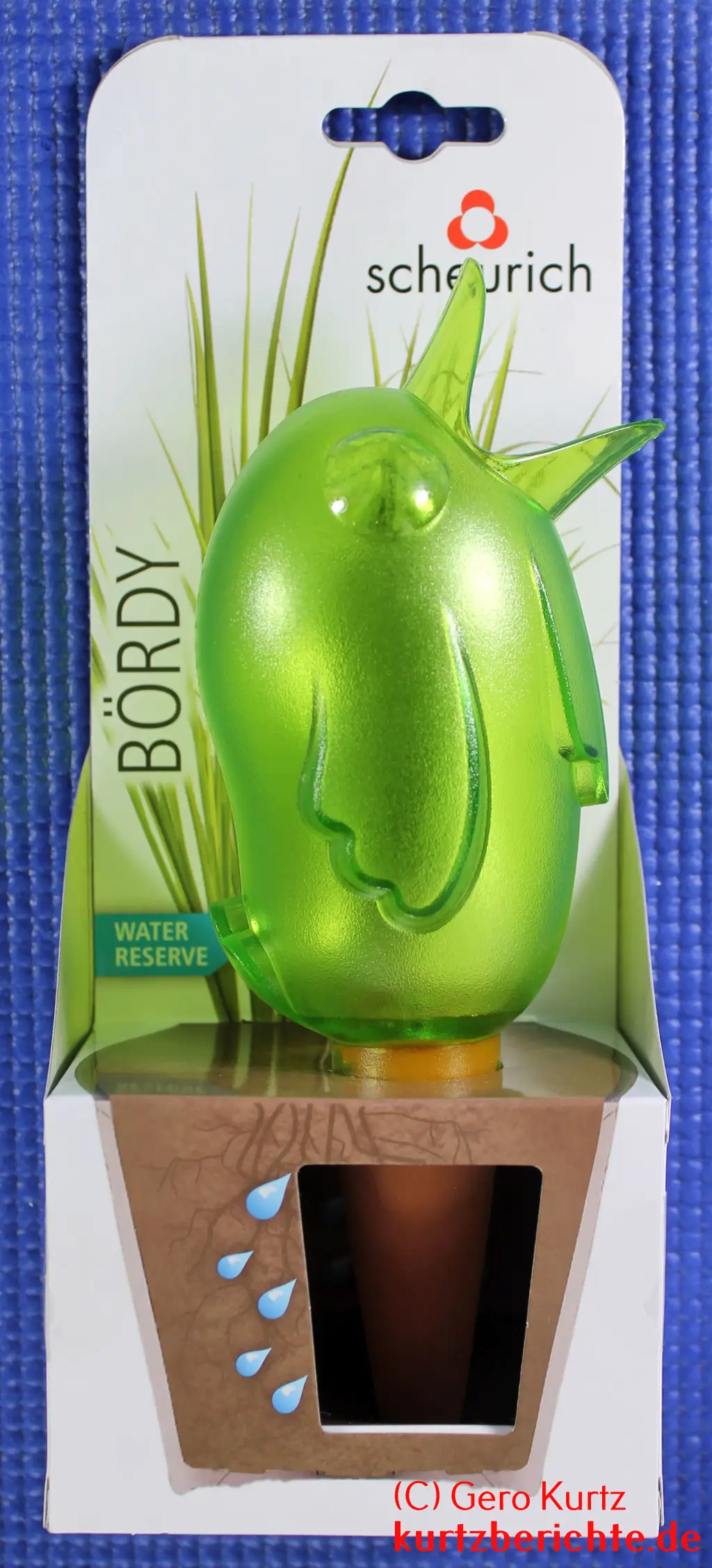 Die Wasserreserve hat die Form eines Vogels (Spatz) und hat den Namen Bördy. Er besteht oben aus grünem Plastik und unten aus einem Kegel aus Ton. Die Länge über alles beträgt ca. 20,5 cm. Dabei beträgt die Länge des Tonkegels etwa 7,5 cm und der Vogelkörper ca. 13 cm. Das Leergewicht beträgt ca. 85 Gramm. Das gemessene Fassungsvermögen liegt bei etwa 194 ml. Der geöffnete Schnabel dient als Einfüllöffnung.