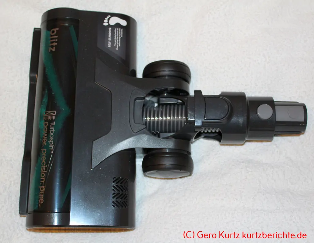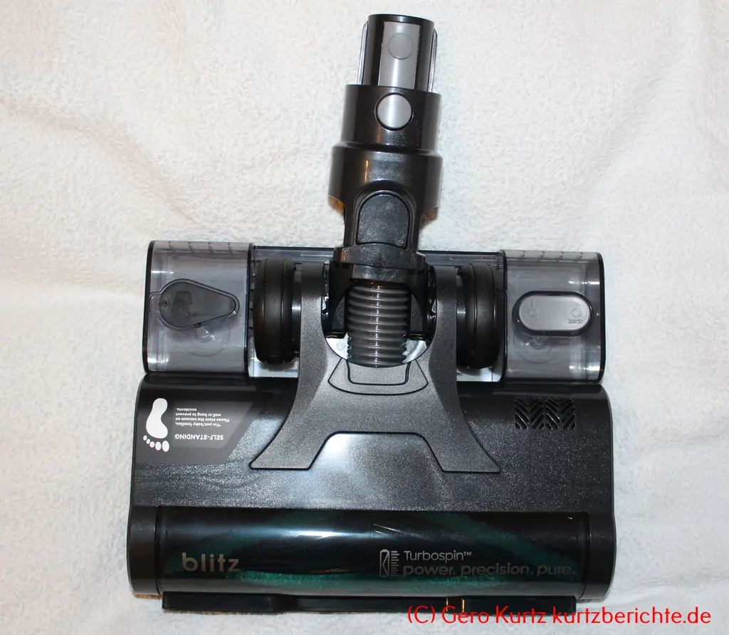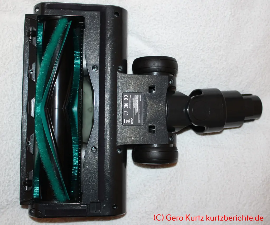 Große Bodendüse: Etwa 25,5 cm breit (gesamt), Arbeitsbreite ca. 22 cm. Besitz auf der Unterseite eine rotierende Rolle zur Aufnahme von Schmutz und Haaren. Außerdem sind sechs LEDs zur Beleuchtung vorhanden. Über einen Schalter kann die Rolle zur Reinigung herausgenommen werden.