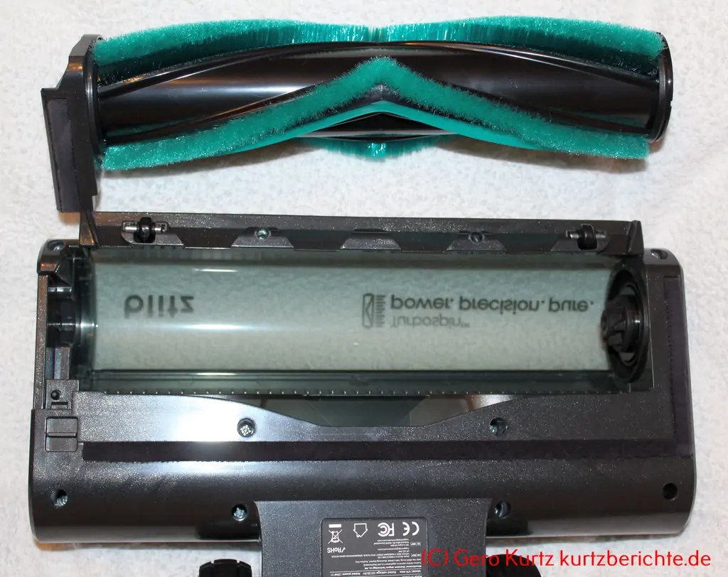 Bei der Bodendüse kann man durch das Ziehen des Entriegelungshebels die Rolle zur Reinigung herausnehmen. Dann mit dem mitgelieferten Werkzeug (Pinsel mit Haken) eventuelle Fasern, welche sich um die Rolle gewickelt haben, durchtrennen bzw. abziehen.