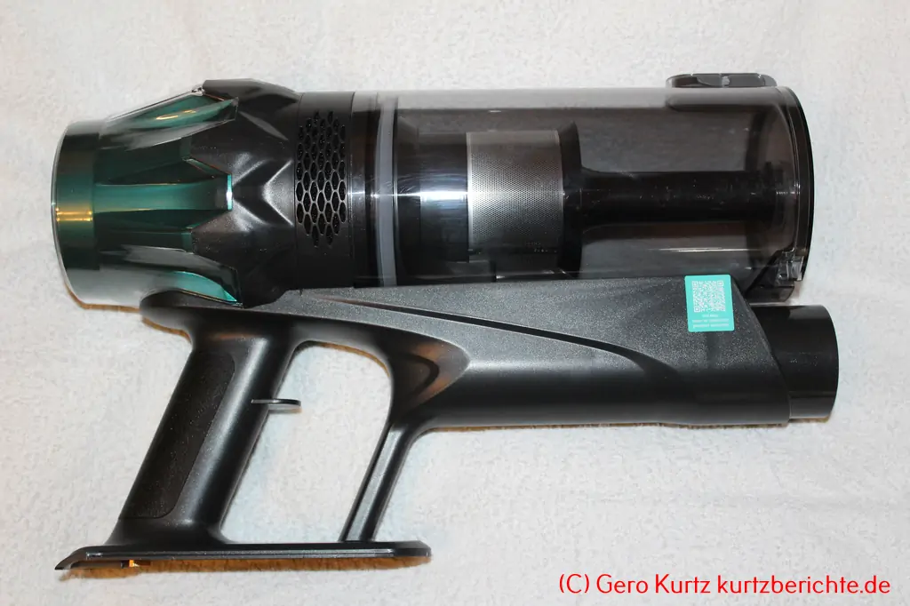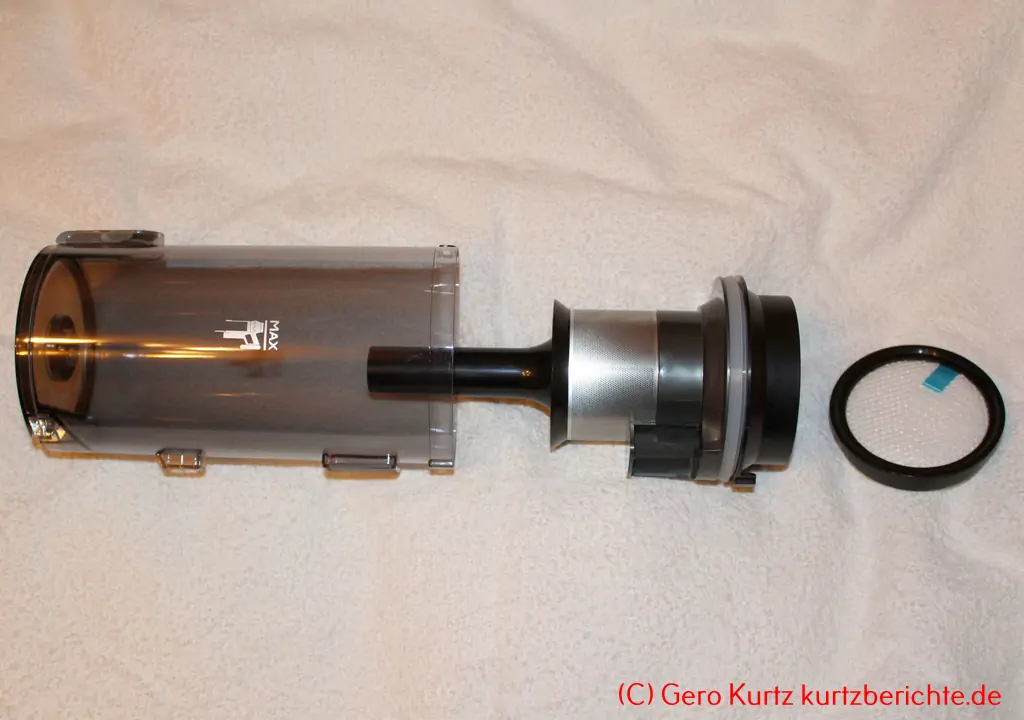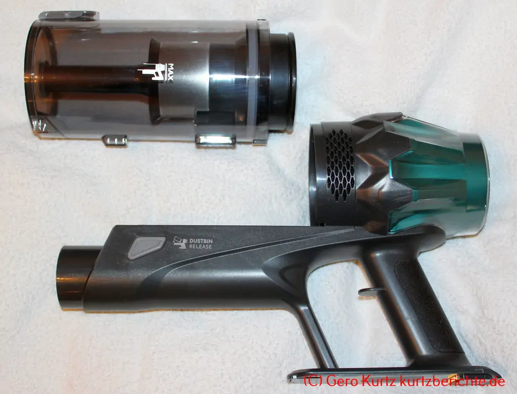 Ganz vorn oben befindet sich der Staubbehälter. Dieser besitzt ganz unten eine Klappe, welche sich zum Entleeren per Knopfdruck öffnen lässt. Der graue Knopf sitzt dafür ganz oben direkt an der Klappe. Ansonsten kann der gesamte Staubbehälter durch Drücken der grauen unteren Taste nach oben abgenommen und zur Reinigung zerlegt werden. Dazu den HEPA-Filter + Schaumstoff herausnehmen und den inneren Filter mit einer leichten Drehung herausziehen.
