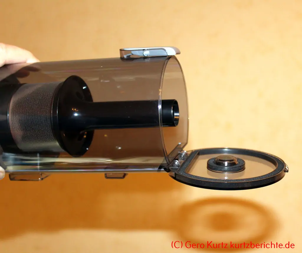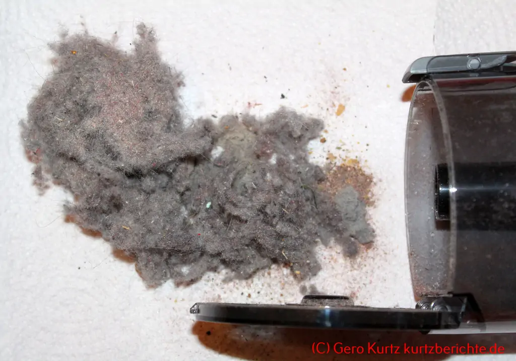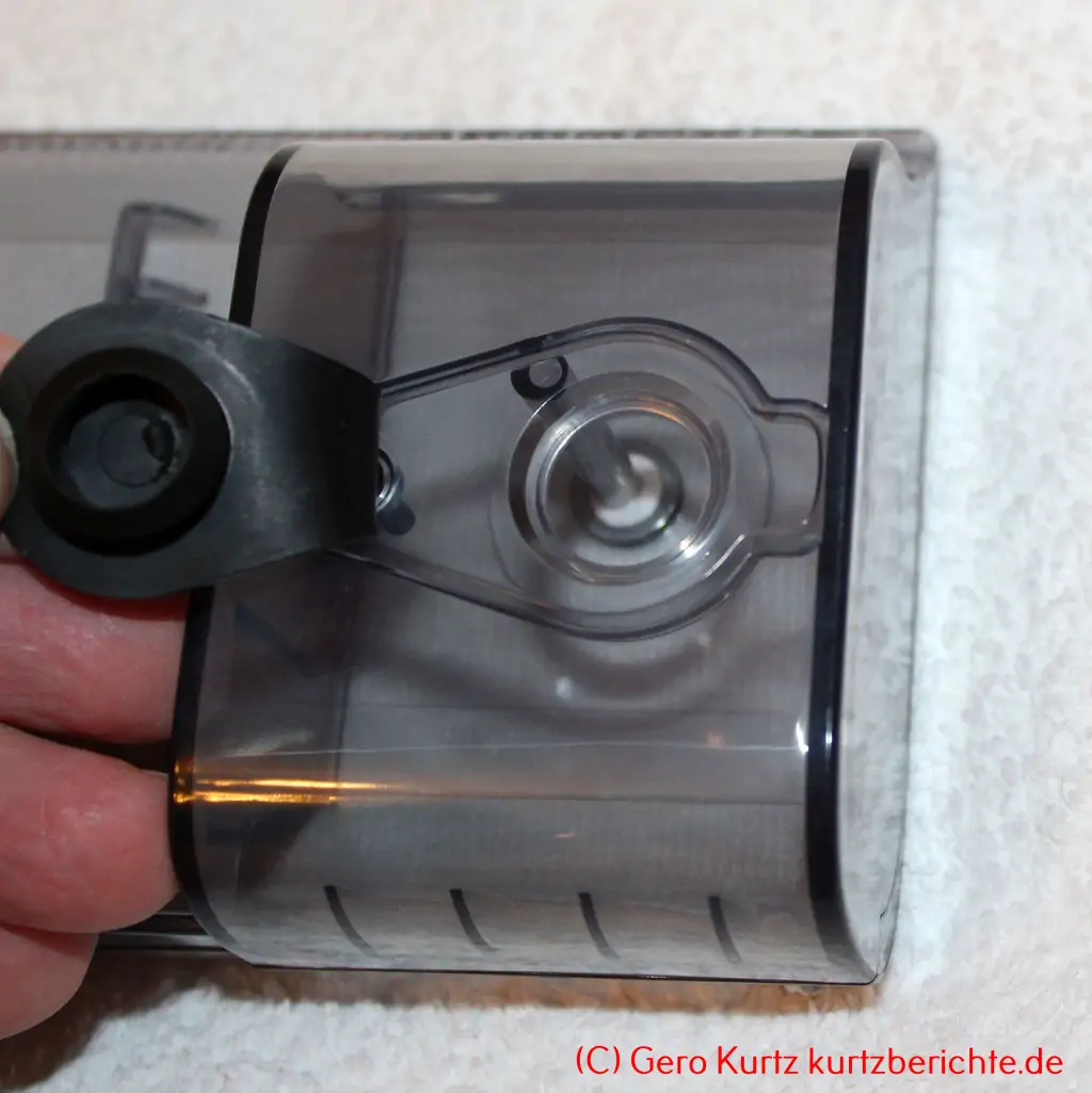 Der aufgefangene Staub kann im Staubfach des Saugers beobachtet werden. Die zulässige Staubmenge ist durch eine „Max-Linie“ gekennzeichnet. Zum Ausleeren braucht nur die graue Taste oben am Staubbehälter gedrückt zu werden und der Staub fällt dann heraus. Dies sollte dann am besten direkt über dem Mülleimer oder der Mülltonne erfolgen.