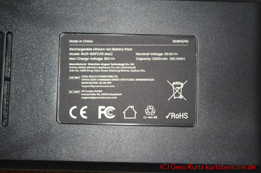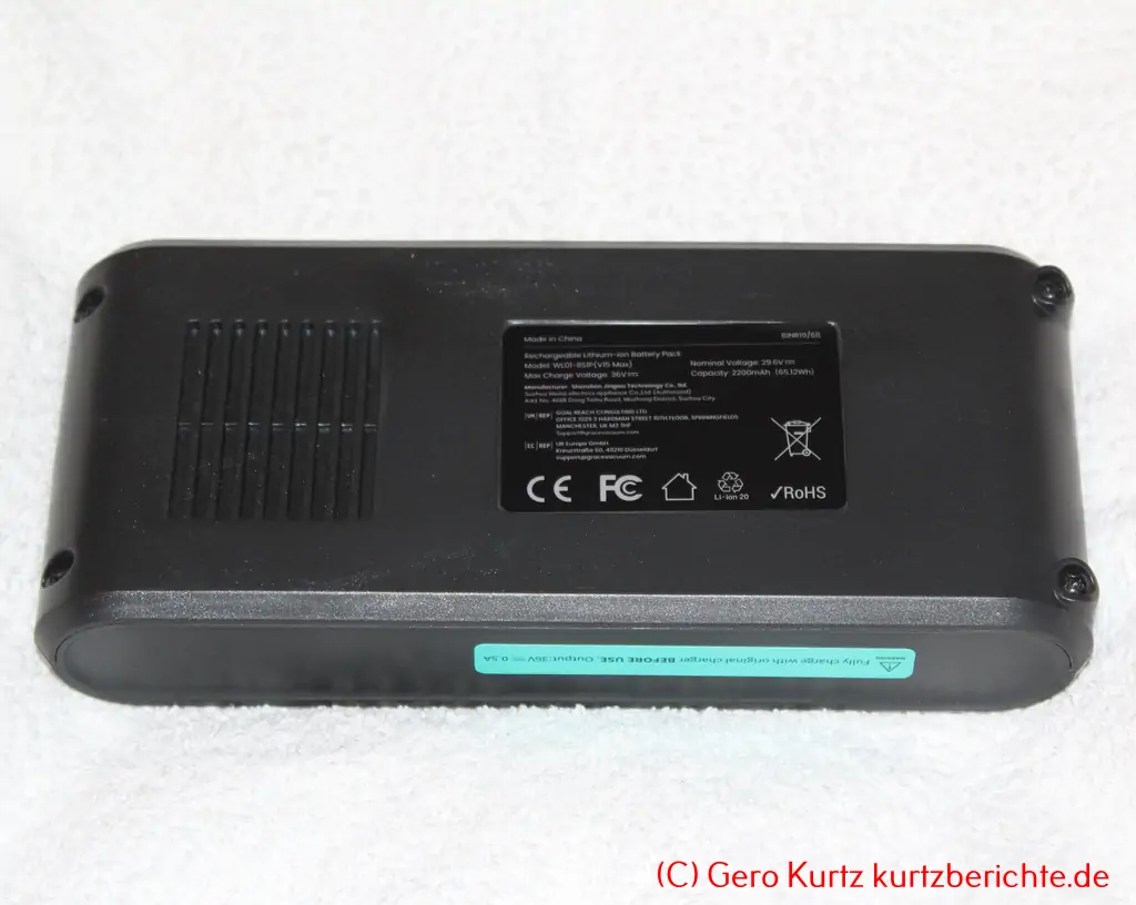 Unten am Griff befindet sich der 29,6 V Akku, Modell WL01-8S1P. Über einen grauen Knopf am Akku kann dieser gelöst werden.