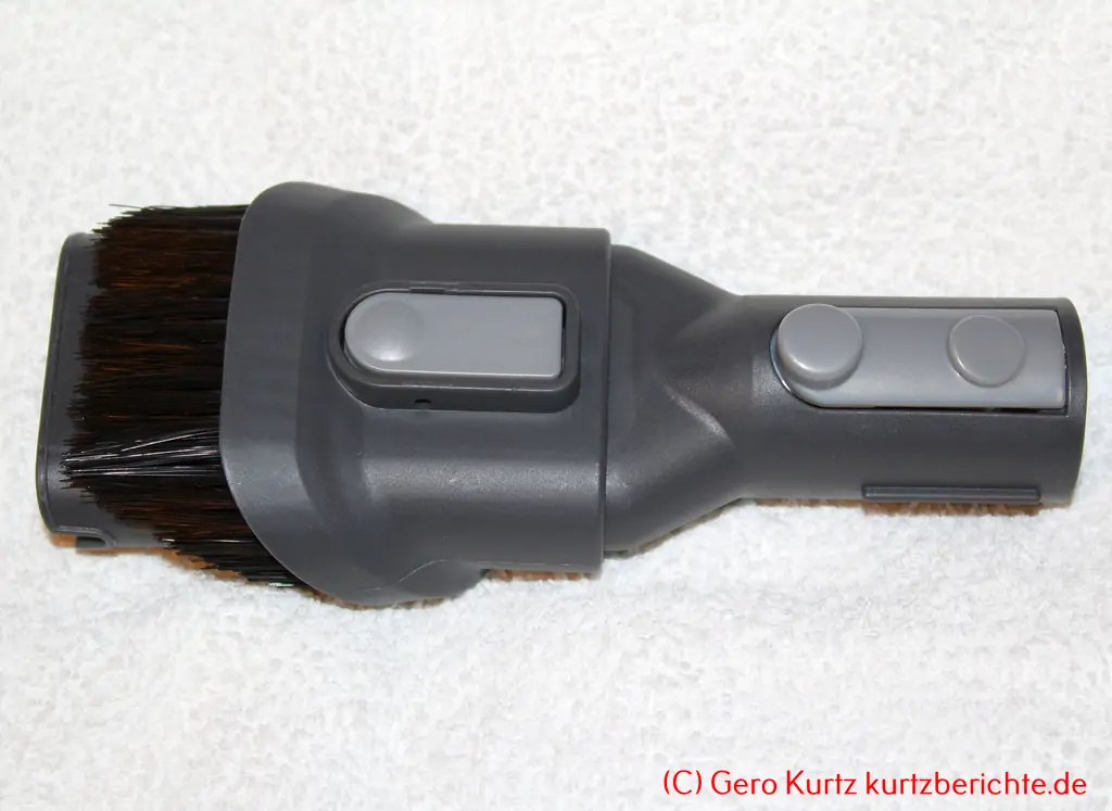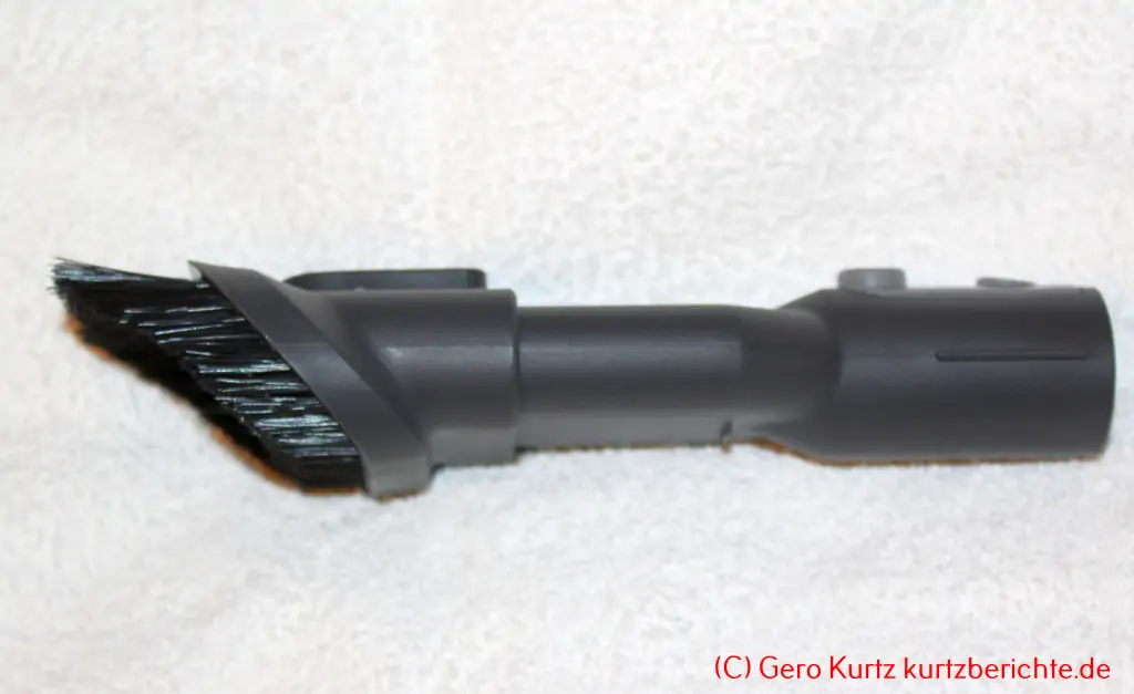 2-in-1 Reinigungsbürste: Hat eine Länge von ca. 21 cm. Vorn befindet sich eine abgeschrägte Polsterdüse. Per Knopfdruck kann ein Pinselaufsatz (Pinsellänge ca. 2,5 cm) nach vorn verschoben werden, um empfindliche Teile abzusaugen.
