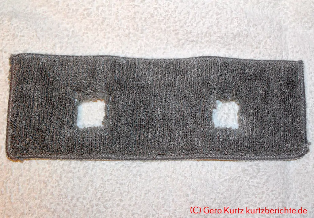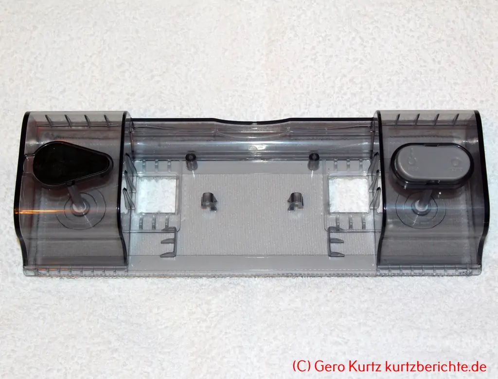 Wassertankaufsatz: Dieser hat eine Länge von 25,5 cm und besteht aus durchsichtigen Plastik. Auf der Unterseite ist per Klettverschluss ein Wischlappen angebracht.
