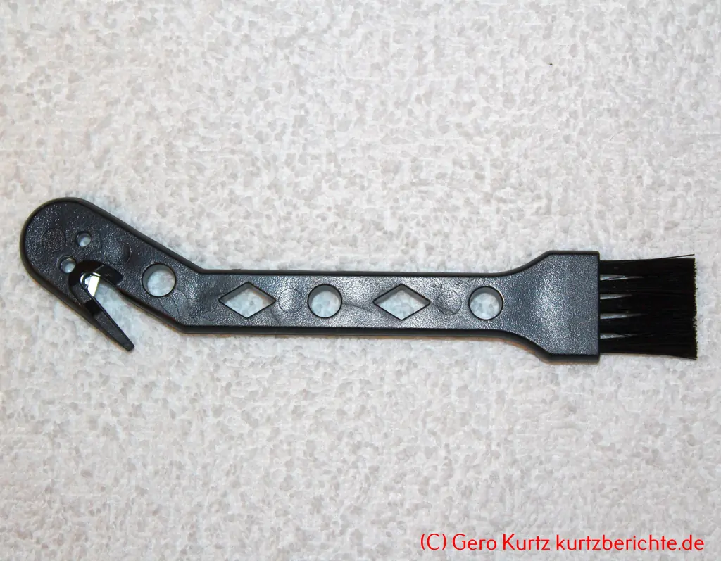 Die Mini-Reinigungsbürste hat an einem Ende einen kleinen Pinsel und am anderen Ende einen Haken zur Entfernung von Haaren aus der Walze.