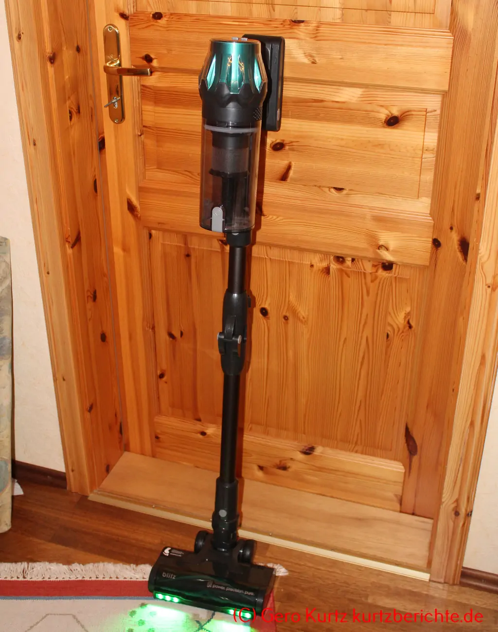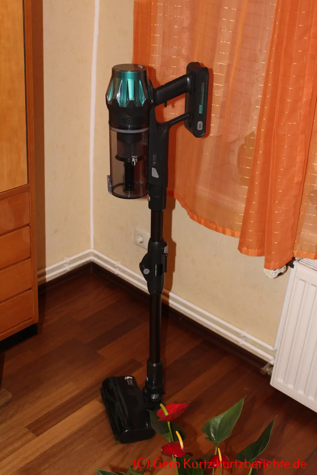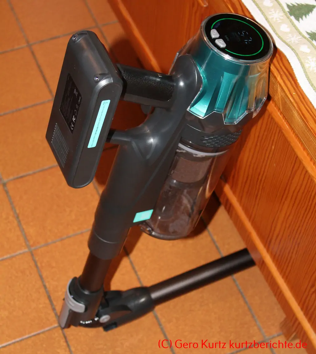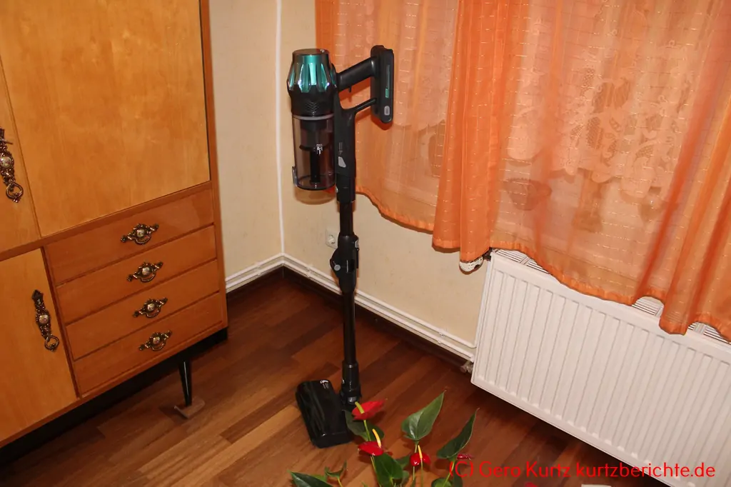 Das Gewicht des Staubsaugers ist mit ca. 2,9 kg (mit Rohr und Bodendüse) recht gering. Die Bodendüse lässt sich im 90-Grad-Winkel arretieren und dann kann der Staubsauger sogar frei im Raum stehen. Ansonsten gibt es auch eine kleine Halterung für die Wand. Diese hat aber keine automatische Ladefunktion, sondern das Kabel muss per Hand in den Akku eingesteckt werden.