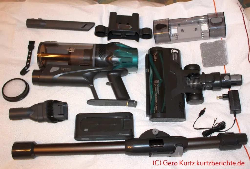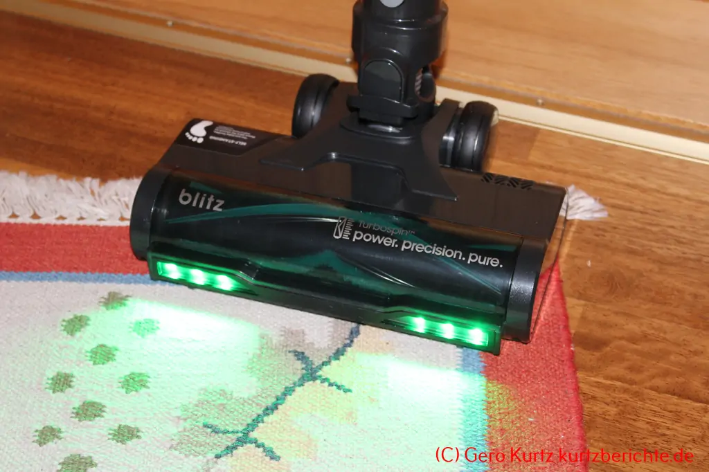 Das Zubehör ist umfangreich und funktionell. In der Hauptsache ist der Staubsauger für glatte Böden und Teppiche bis mittlere Florhöhe konzipiert. Hier verrichtet er seine Arbeit einwandfrei. Die Bodendüse arbeitet elektrisch und hat eine sich drehende Rollen/Bürste im Inneren. Dadurch lassen sich hervorragend Staub und Tierhaare aufnehmen. Sechs helle grüne Spezial-LEDs an der großen Bodenbürste lassen jeden Staubfussel auch in dunklen Ecken fluoreszieren. Sie ist extrem gelenkig und kommt somit auch unter sehr enge Hindernisse wie tief liegende Betten. Zudem lässt sie sich zur Reinigung zerlegen.