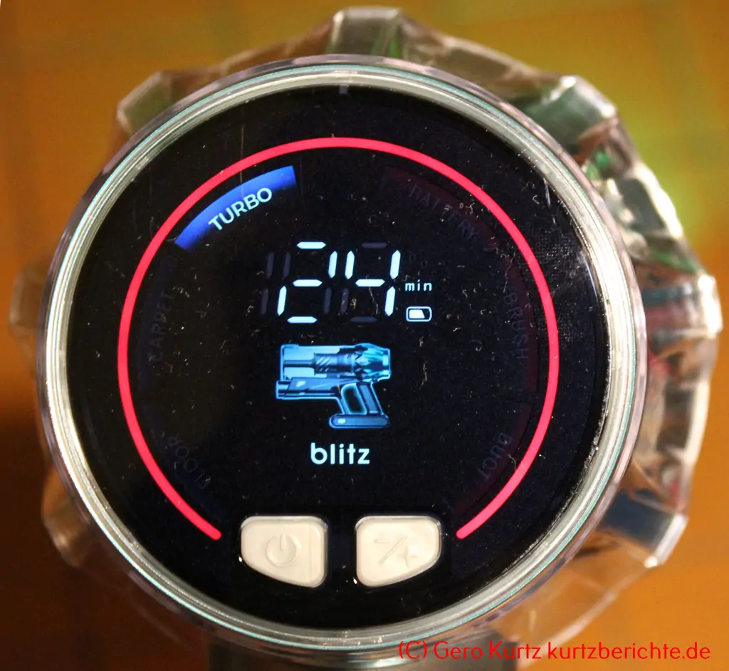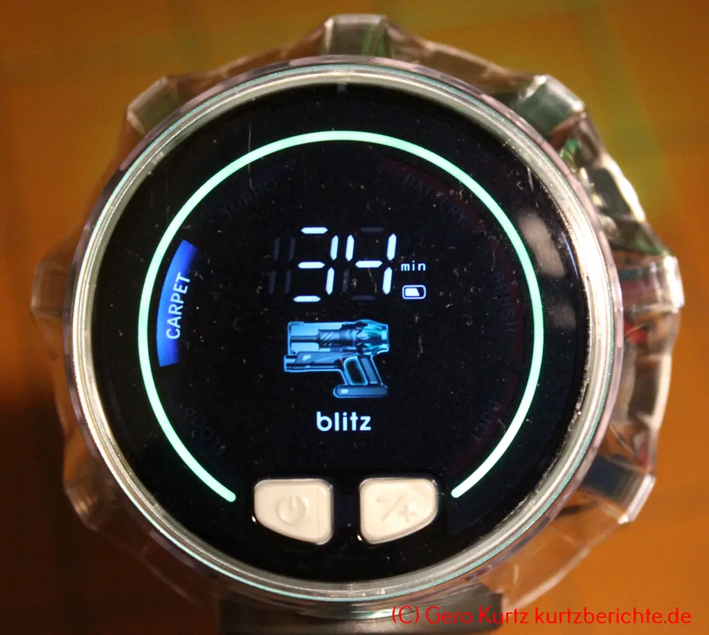 Die Restlaufzeit des jeweils gewählten Reinigungsmodus wird auf dem Display in der Mitte in Minuten angezeigt. Ein kleines Akkusymbol gibt es auch noch. Fällt die Akkuleistung unter 10 %, fängt das Akkusymbol an rot zu blinken.