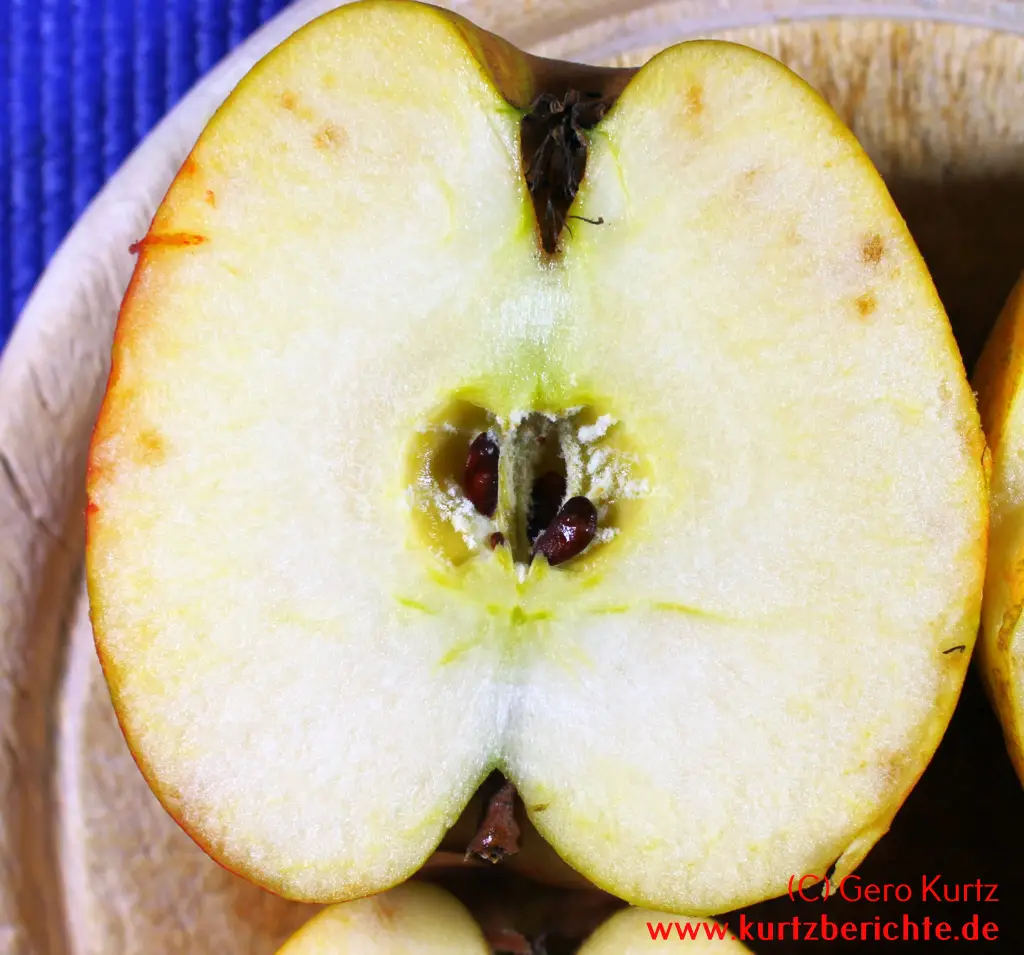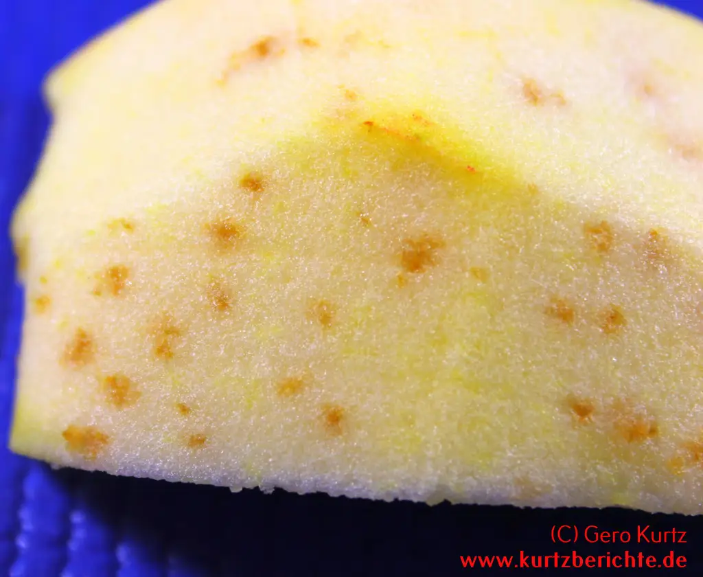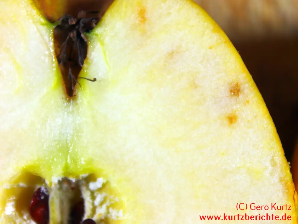 Der Apfel kann von außen perfekt aussehen, aber nach dem Schälen zeigen sich kleine oder größere braune Punkte im Fruchtfleisch. Verstärkt am Rand, aber auch zur Mitte hin. Sehen ein wenig aus wie Sommersprossen. Es ist aber auch möglich, dass man schon von außen auf der Schale leicht eingesunkene, grünliche oder braune Flecken erkennen kann. Der Geschmack an diesen Stellen ist leicht bitter.