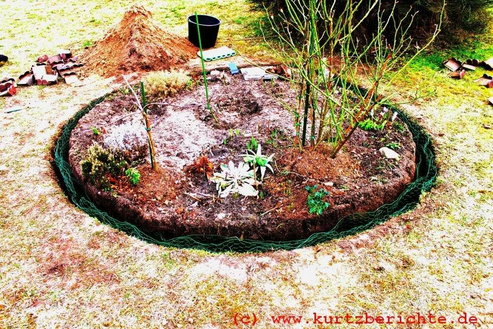 Dieses Jahr bin ich zu einer anderen Methode gewechselt, um zumindest mein Blumenbeet im Garten vor dem Maulwurf zu schützen. Ich hatte noch eine ganze Menge Kükendraht zu liegen und habe rund um das Blumenrondell einen schmalen und tiefen Graben ausgehoben und dort den Kükendraht als Schutz versenkt. Bis jetzt hält sich der Maulwurf dran. Der Draht sollte mindestens 55 cm tief sein, damit sich der Maulwurf nicht darunter durchbuddelt.