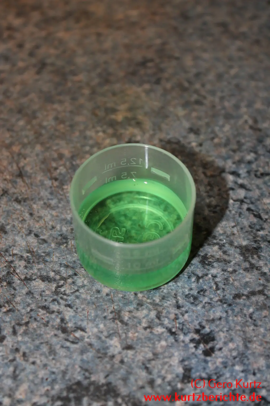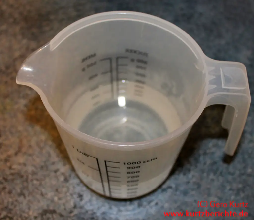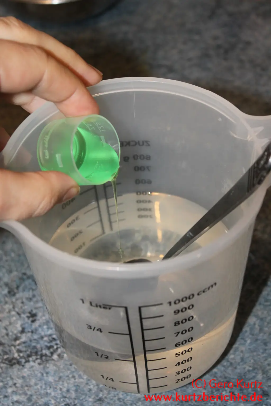 in einem Messbecher Spülmittel-/Reinigungsmittel als Emulgator Menge nach Wunsch, mindestens aber einen halben Teelöffel