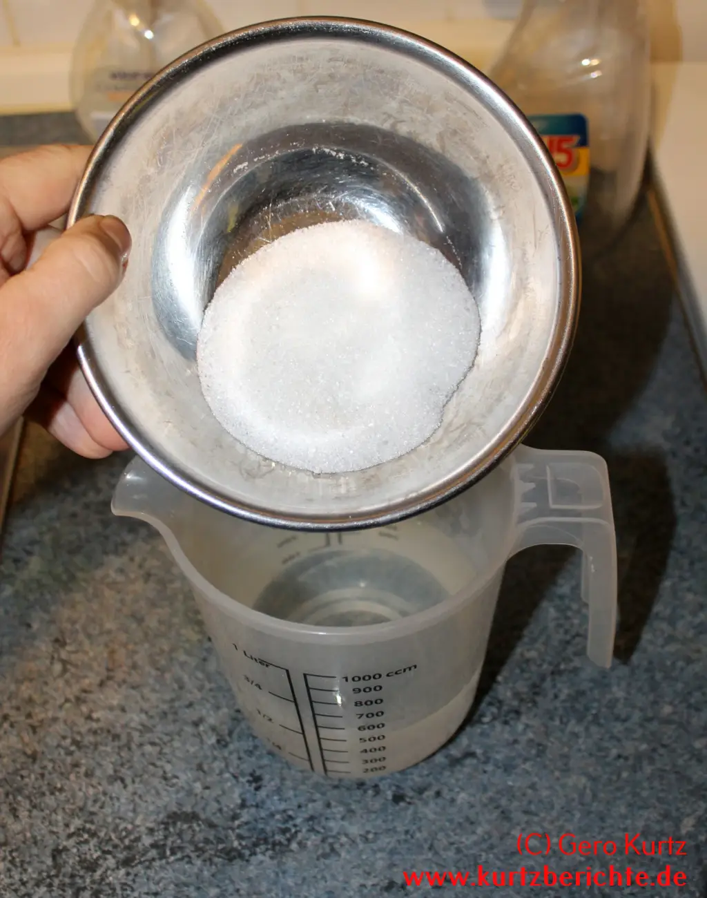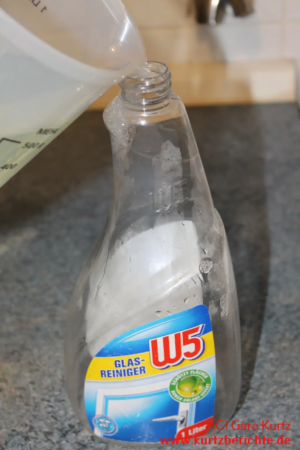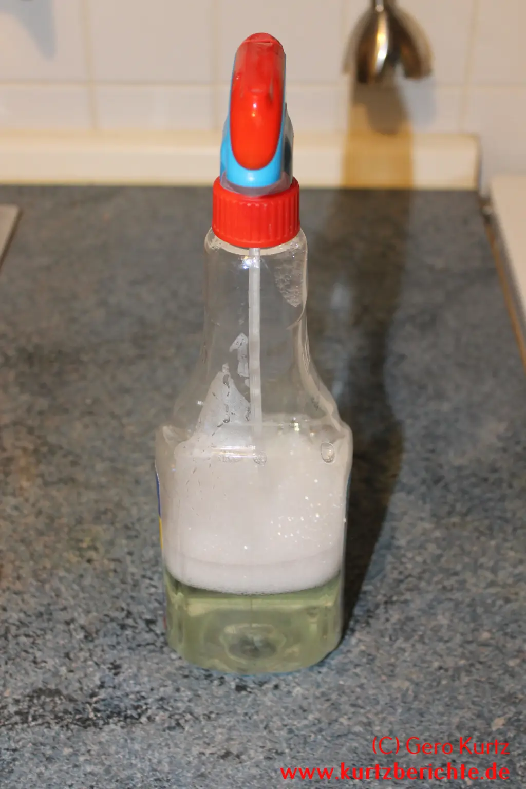 Dann messen Sie bitte mittels Waage 30 Gramm oder Milliliter Zitronensäure ab. Danach gießen Sie 500 ml warmes (das Granulat löst sich dann besser auf) Wasser in den Mischbehälter und geben Sie dann die abgewogene Zitronensäure hinzu. Nehmen Sie den Löffel und rühren Sie so lange bis sich die Kristalle vollständig aufgelöst haben. Nun geben Sie noch das Spülmittel hinzu und rühren noch mal vorsichtig um. Danach kippen Sie die Lösung in die Sprayflasche (eventuell einen Trichter benutzen).