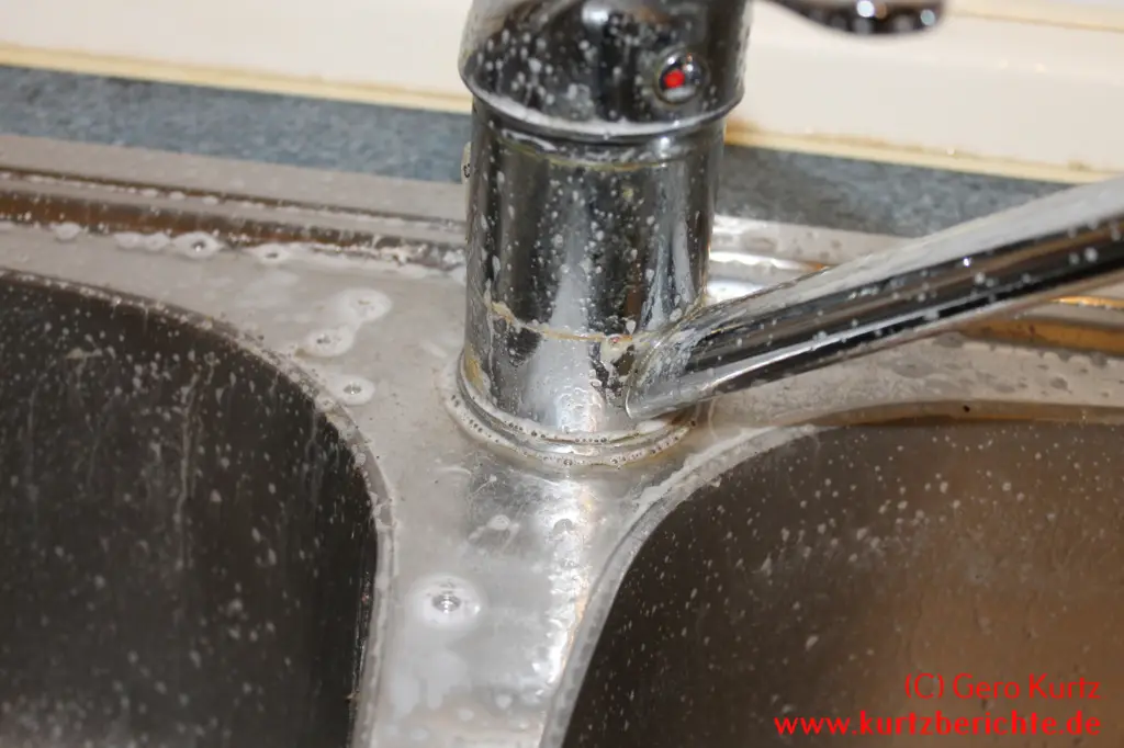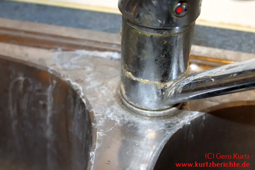 Nun können wir den neuen Badreiniger ausprobieren, ob er auch funktioniert. nehmen wir mal einen recht verkalkten Bereich um einen Wasserhahn (hatte leider ein Leck). Zitronenreiniger überall gut aufsprühen und je nach Verkalkung 5 bis 10 Minuten einwirken lassen. Danach mit Wasser gut abspülen und mit einem Schwamm die Reste gut abrubbeln. Falls dann immer noch etwas da ist, den Vorgang wiederholen. Wie man auf den Bildern sieht, der Badreiniger funktioniert ausgezeichnet. Nach 10 min Einwirkzeit ist alles weg.