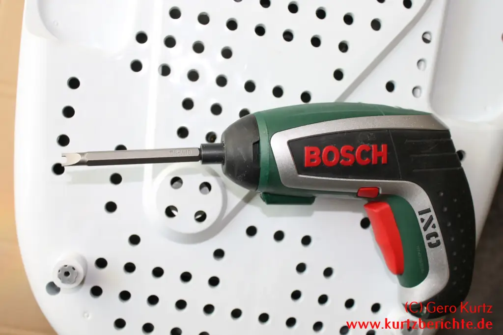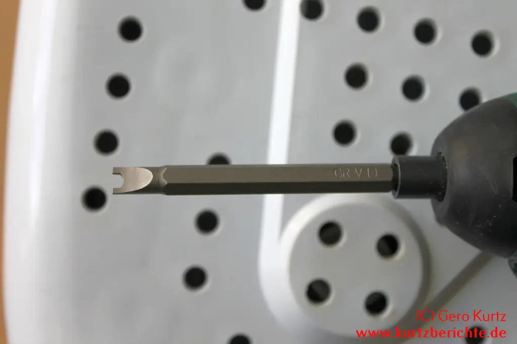 Vor der Demontage müssen Sie sich klar sein, dass eventuell eine Montage nicht mehr möglich oder zumindest recht schwer ist. Weiterhin benötigen Sie einen Spezialschraubendreher (siehe Fotos). Ich habe diesen in einem Bitset günstig auf einem Trödelmarkt erstanden, das Set aber auch zu einem günstigen Preis bei Amazon gefunden: