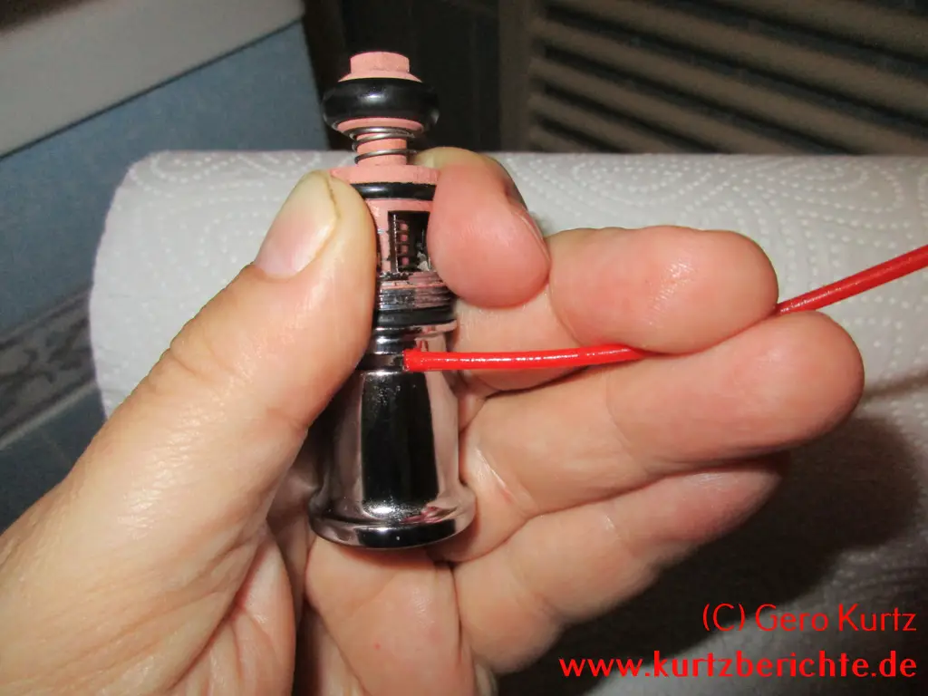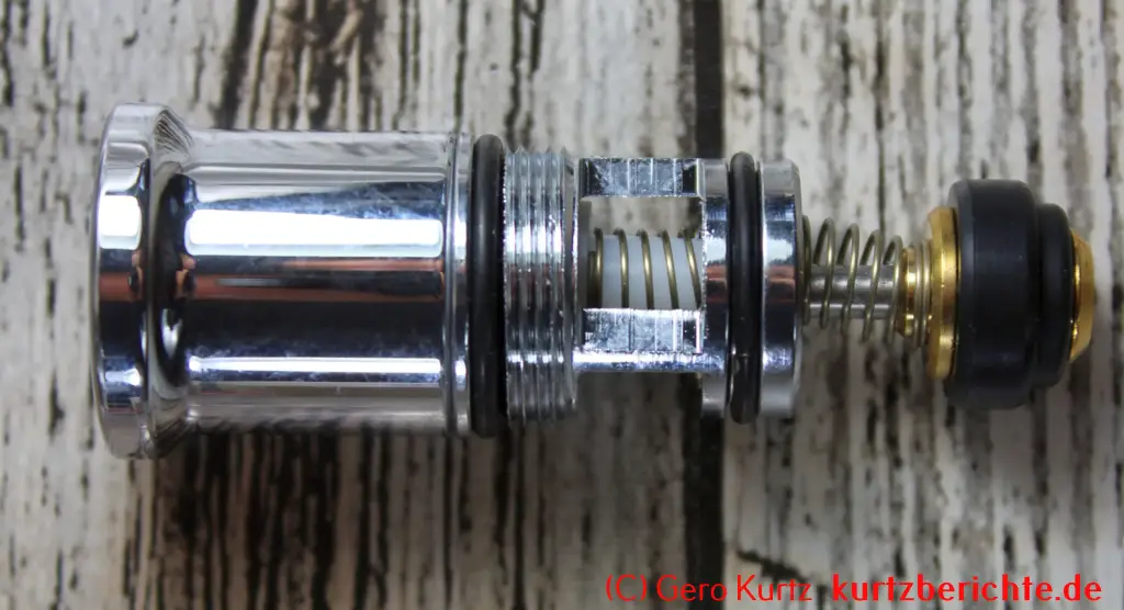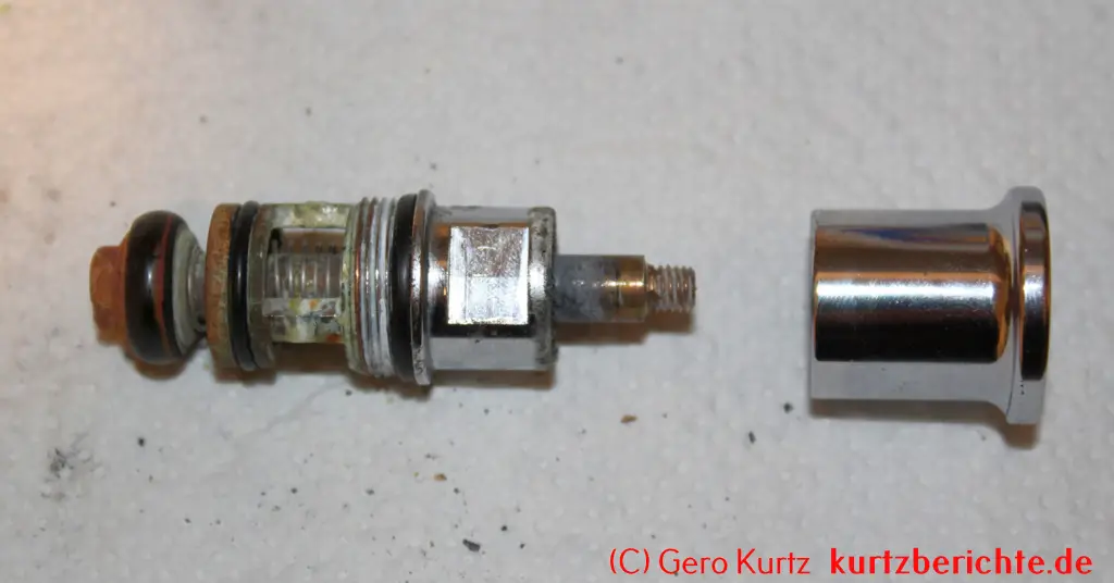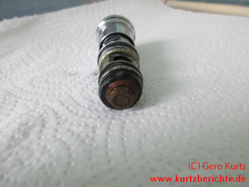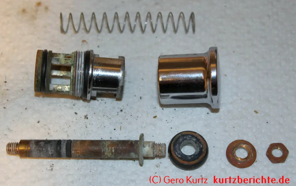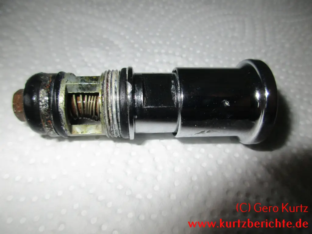 Es ist auch möglich, das Ventil vollständig in alle Einzelteile zu zerlegen. Alles, was man dafür benötigt, ist ein 8er-Schraubenschlüssel und eine Zange. Mit dem Schraubenschlüssel die kleine Mutter ganz unten festhalten und oben den verchromten Kopf nach links abdrehen. Dann mit einer Zange den Stab festhalten und die kleine Mutter mit dem Schraubenschlüssel nach links losdrehen. Jetzt hat man Zugriff auf die Gummidichtung, Feder usw. und kann sie bei Bedarf wechseln.