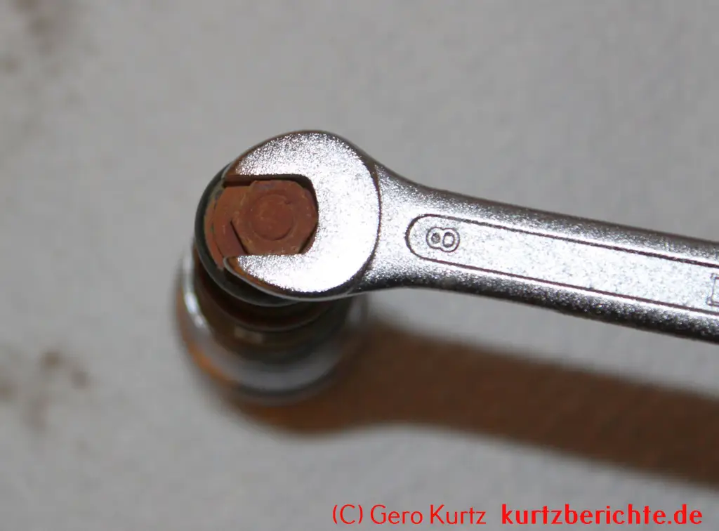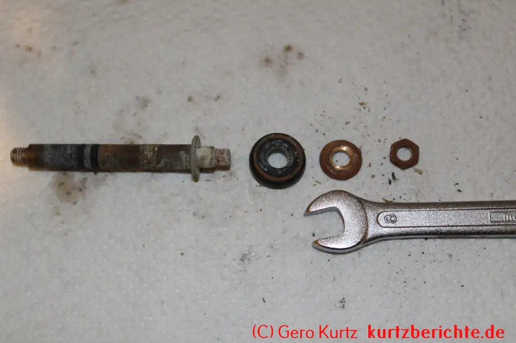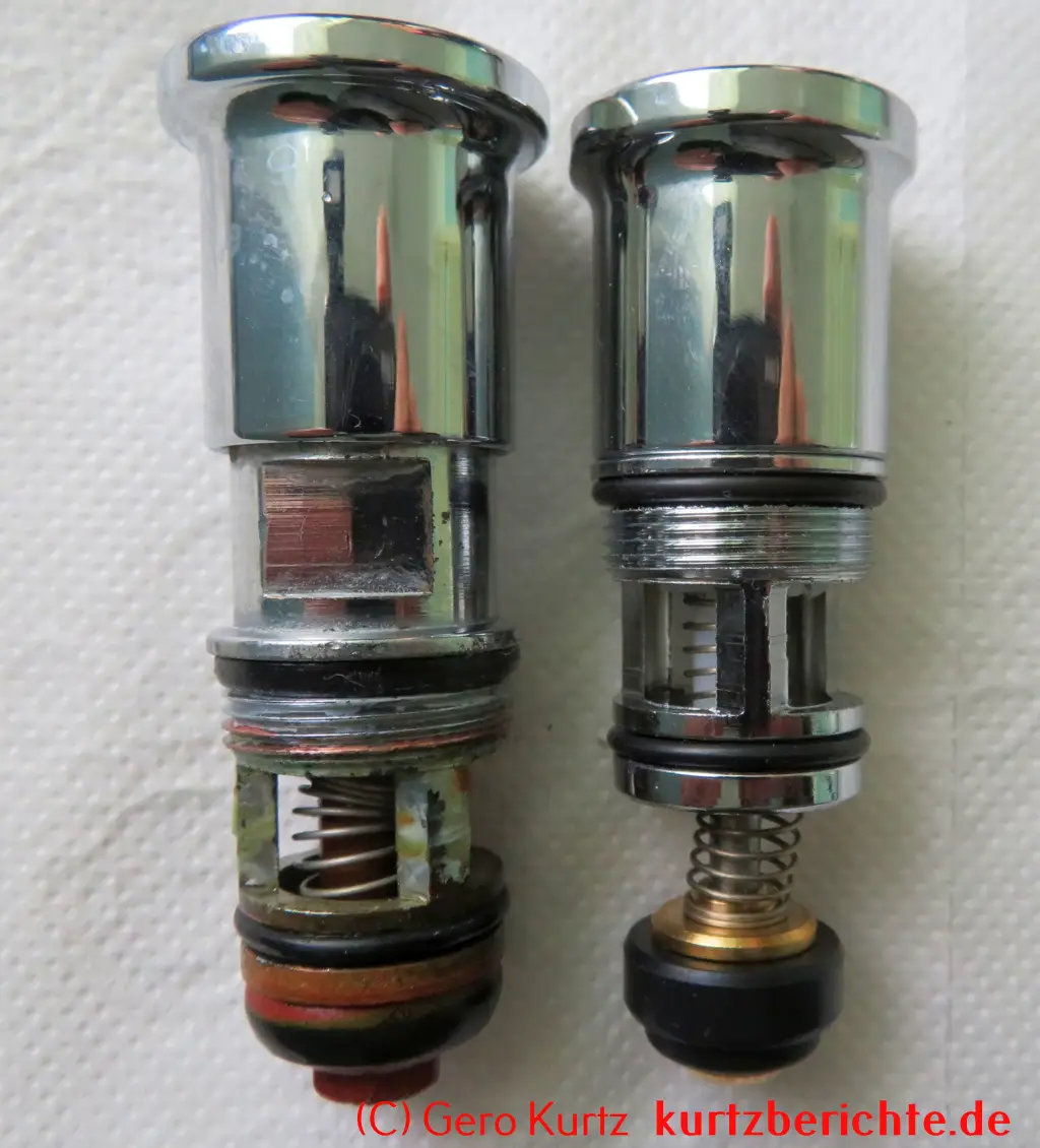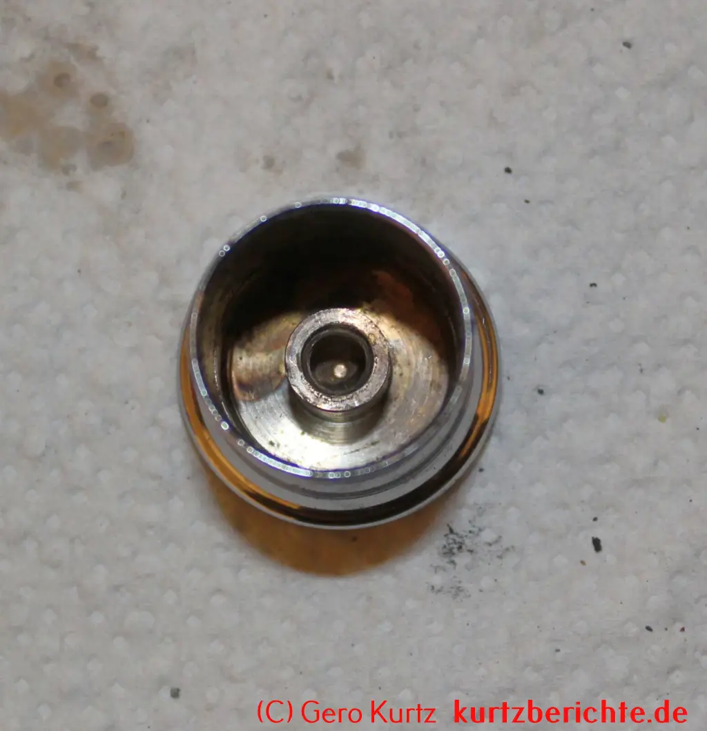 Es ist auch möglich, das Ventil vollständig in alle Einzelteile zu zerlegen. Alles, was man dafür benötigt, ist ein 8er-Schraubenschlüssel und eine Zange. Mit dem Schraubenschlüssel die kleine Mutter ganz unten festhalten und oben den verchromten Kopf nach links abdrehen. Dann mit einer Zange den Stab festhalten und die kleine Mutter mit dem Schraubenschlüssel nach links losdrehen. Jetzt hat man Zugriff auf die Gummidichtung, Feder usw. und kann sie bei Bedarf wechseln.
