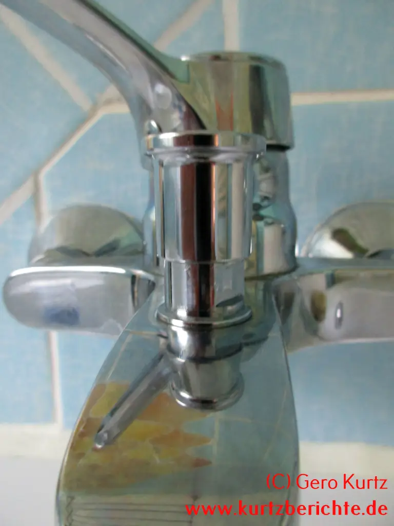 Vor Beginn der Arbeiten, am besten die Wasserzufuhr im Badezimmer abdrehen, damit es kein nasses Unglück gibt. Falls das nicht möglich ist, dann auf jeden Fall sicherstellen, dass der Armaturenhebel geschlossen ist. Eventuell mit Paketband fixieren.